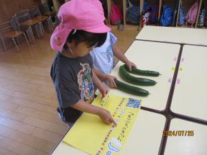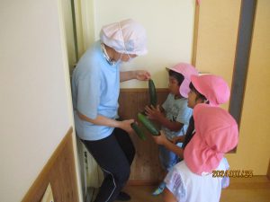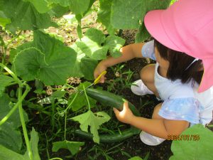 年中さんはきゅうりの収穫です。