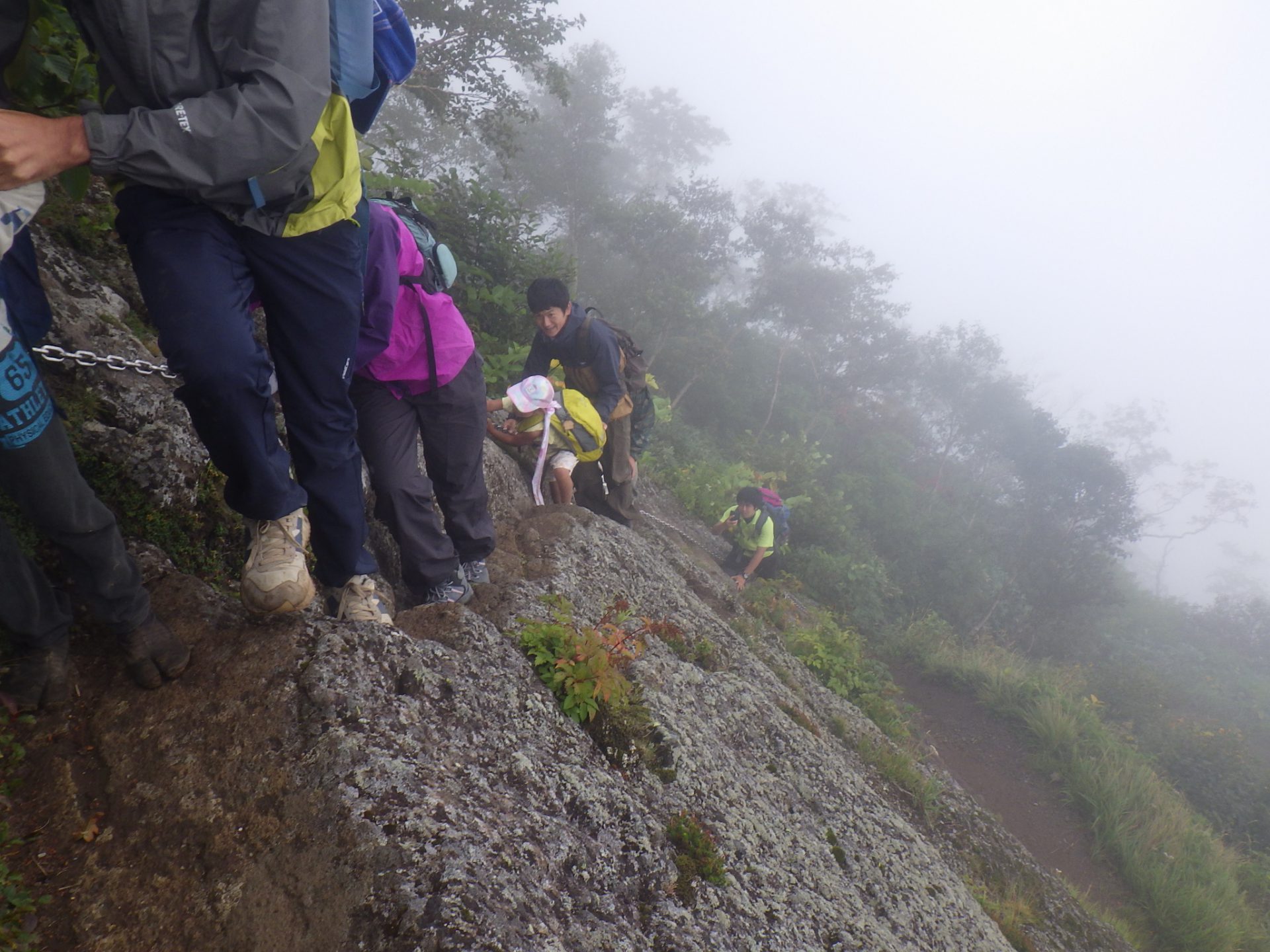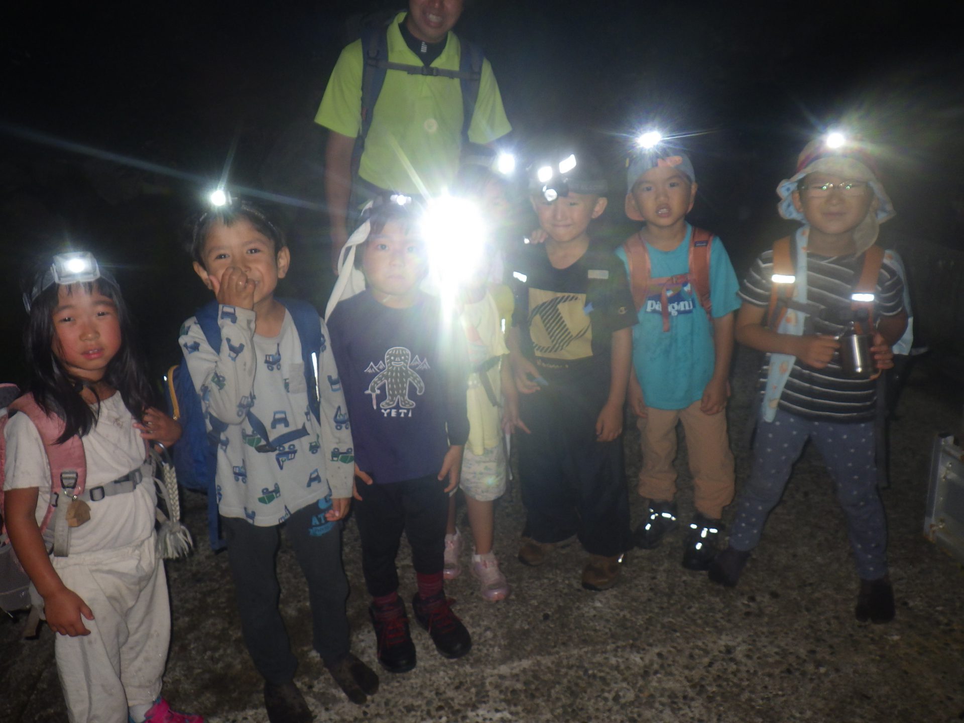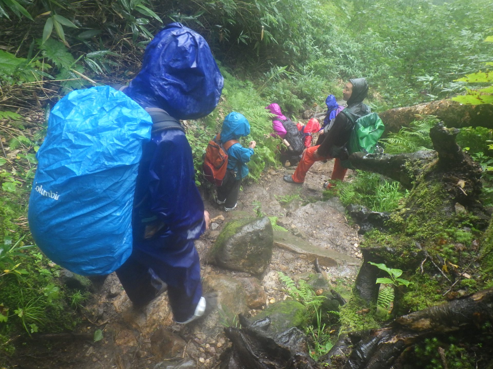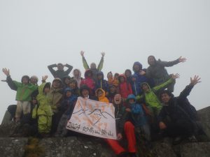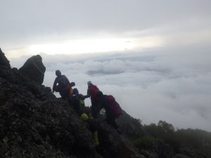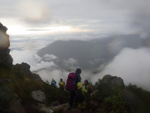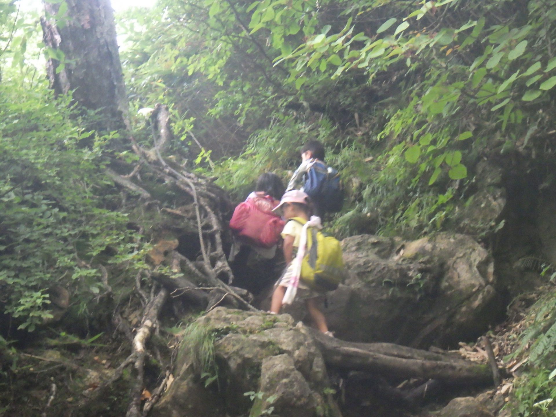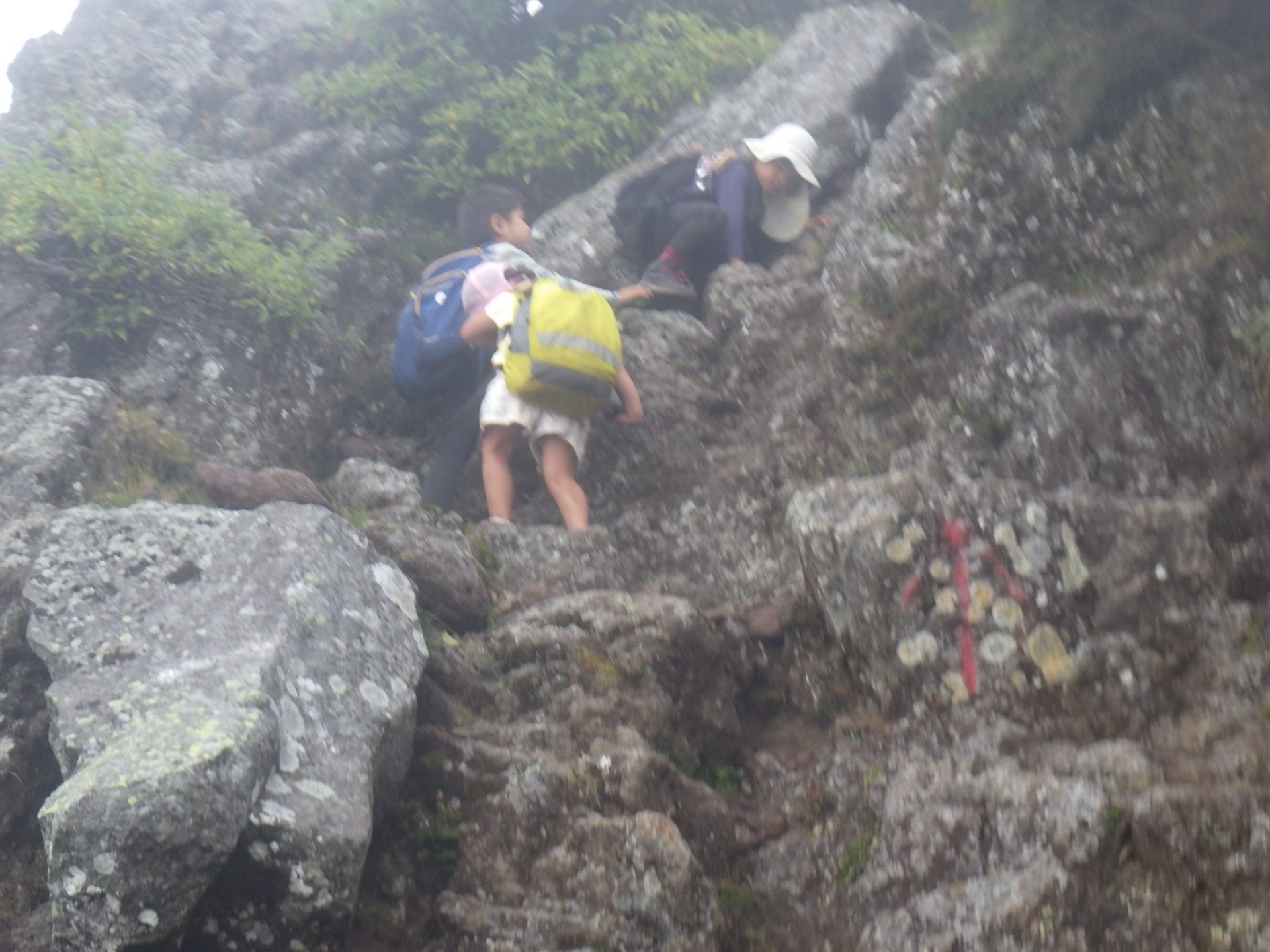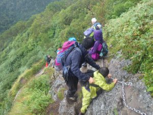 15年ぶりに、年長児が妙高登山に挑戦しました。朝3時半燕温泉駐車場集合。親は、一足先に出発し、9合目鎖場で待つ。子どもたちは、10分遅れで、スタッフ2名と出発。大人のコースタイム 7時間15分(休憩無し) 距離9,2キロ 標高差 1273㍍ の難易度を誇ります。台風の近づく中、出発は晴れ、午後から雨という予報の中、大人顔負けのピッチで進み、難所の胸突き八丁を果敢に登り切り、6合目の天狗堂で6時半。大人に遅れること15分。そして、大人の待つ9合目、最大の難所 鎖場到着7時40分。ここまでは 子どもたちのみで、到着。ここから、親と一緒に鎖場を緊張して登り、8時半無事全員登頂。しばらくして、雨降りとなり、9時下山開始。劇的に 雲が流れ 雲海そして 見事な景色が広がり、大感激。その後、雨が降り出し、慎重に鎖場を降りる。雨の中 下山道の完全天然の滝の下に湧く風呂に入ったり、露天風呂に入ったりしながら、無事 12時、下山となった。雨が降り続いているので、大地へ戻り、頂上で食べる予定であった海鮮丼(全ての材料は、頂上を往復した)を、大地で頂いた。