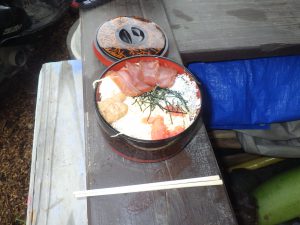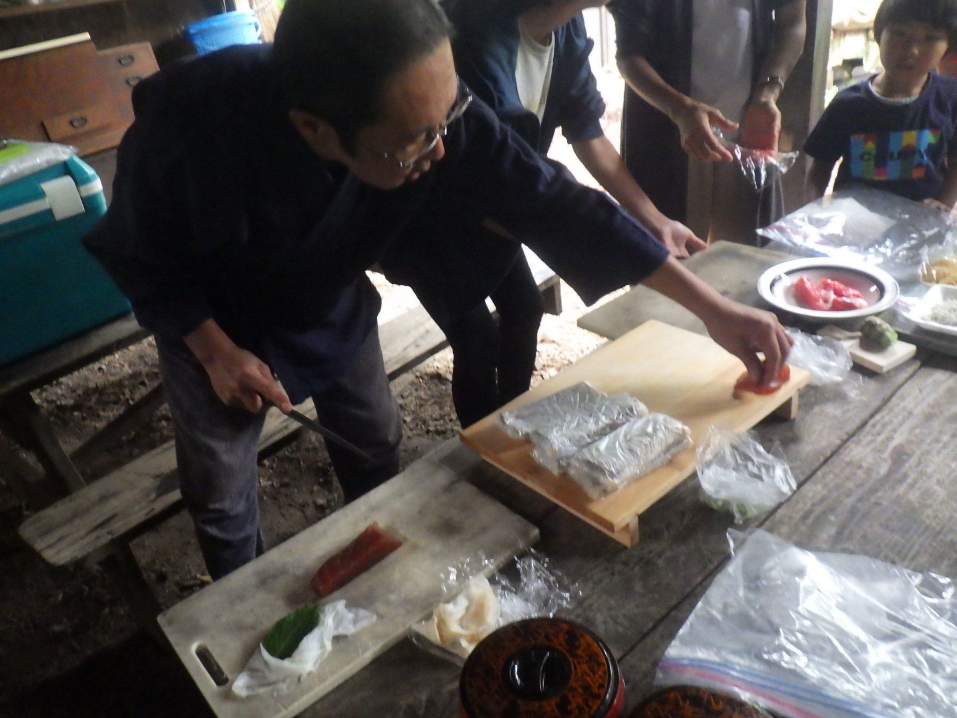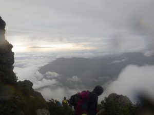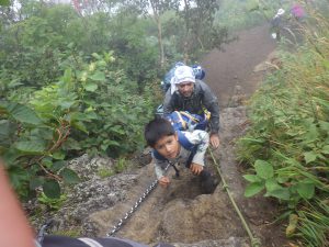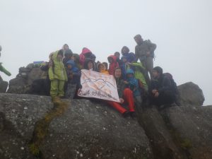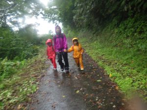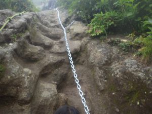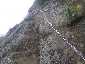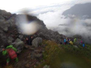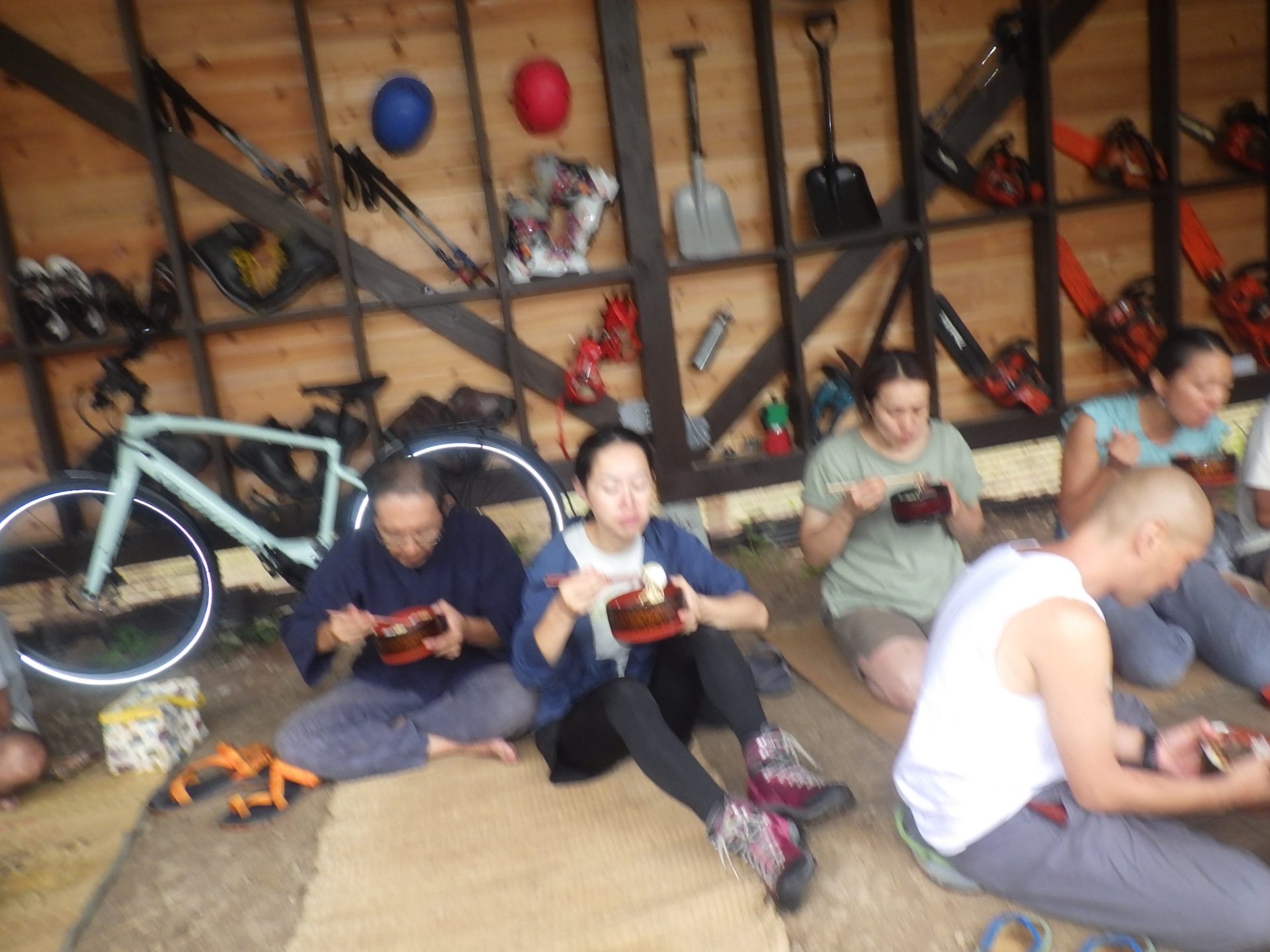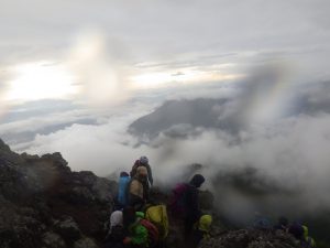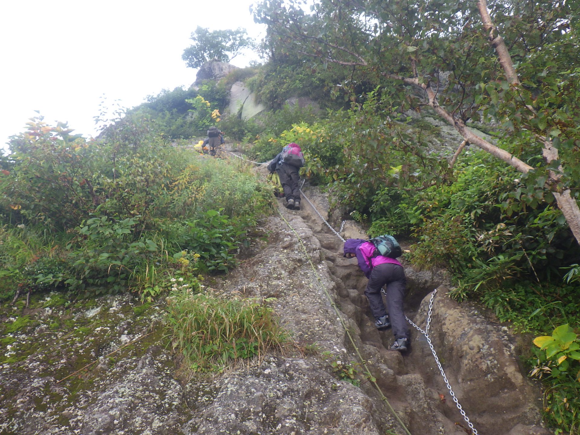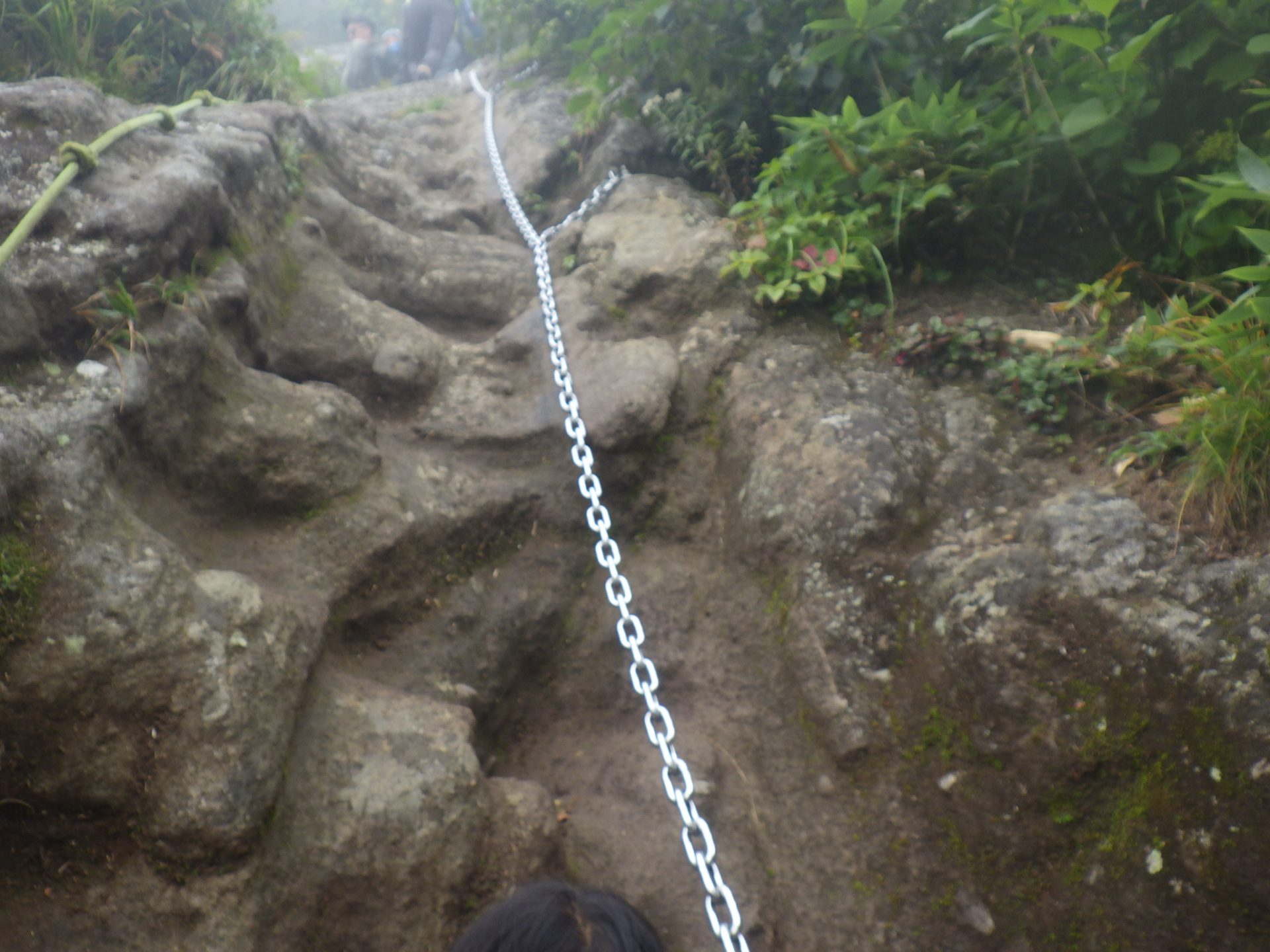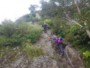 15年ぶりに、年長児が妙高登山に挑戦しました。朝3時半燕温泉駐車場集合。親は、一足先に出発し、9合目鎖場で待つ。子どもたちは、10分遅れで、スタッフ2名と出発。大人のコースタイム 7時間15分(休憩無し) 距離9,2キロ 標高差 1273㍍ の難易度を誇ります。台風の近づく中、出発は晴れ、午後から雨という予報の中、大人顔負けのピッチで進み、難所の胸突き八丁を果敢に登り切り、6合目の天狗堂で6時半。大人に遅れること15分。そして、大人の待つ9合目、最大の難所 鎖場到着7時40分。ここまでは 子どもたちのみで、到着。ここから、親と一緒に鎖場を緊張して登り、8時半無事全員登頂。しばらくして、雨降りとなり、9時下山開始。劇的に 雲が流れ 雲海そして 見事な景色が広がり、大感激。その後、雨が降り出し、慎重に鎖場を降りる。雨の中 下山道の完全天然の滝の下に湧く風呂に入ったり、露天風呂に入ったりしながら、無事 12時、下山となった。雨が降り続いているので、大地へ戻り、頂上で食べる予定であった海鮮丼(全ての材料は、頂上を往復した)を、大地で頂いた。