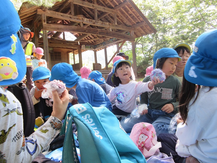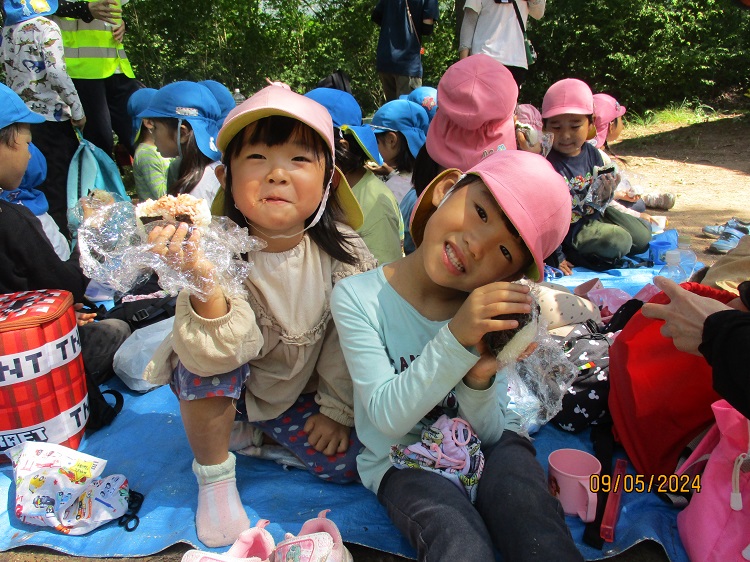 お家の人が作ってくれた愛情たっぷりのおにぎりを、みんな満面の笑顔で食べました。