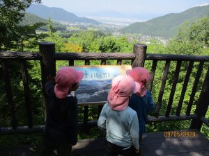 年長さんと年中さんは、バスに乗って離山に登ってきました。