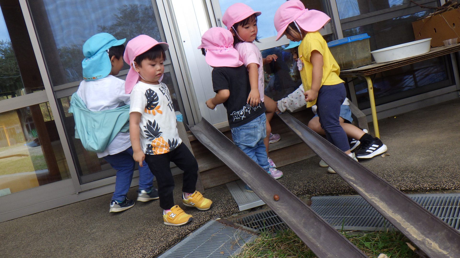 〇お部屋でどんぐり転がしをして遊びました。スピードにのってコースから転がり落ちたり、上手く容器に入らなかったり、いろんな転がり方をするどんぐりに夢中になっていました。