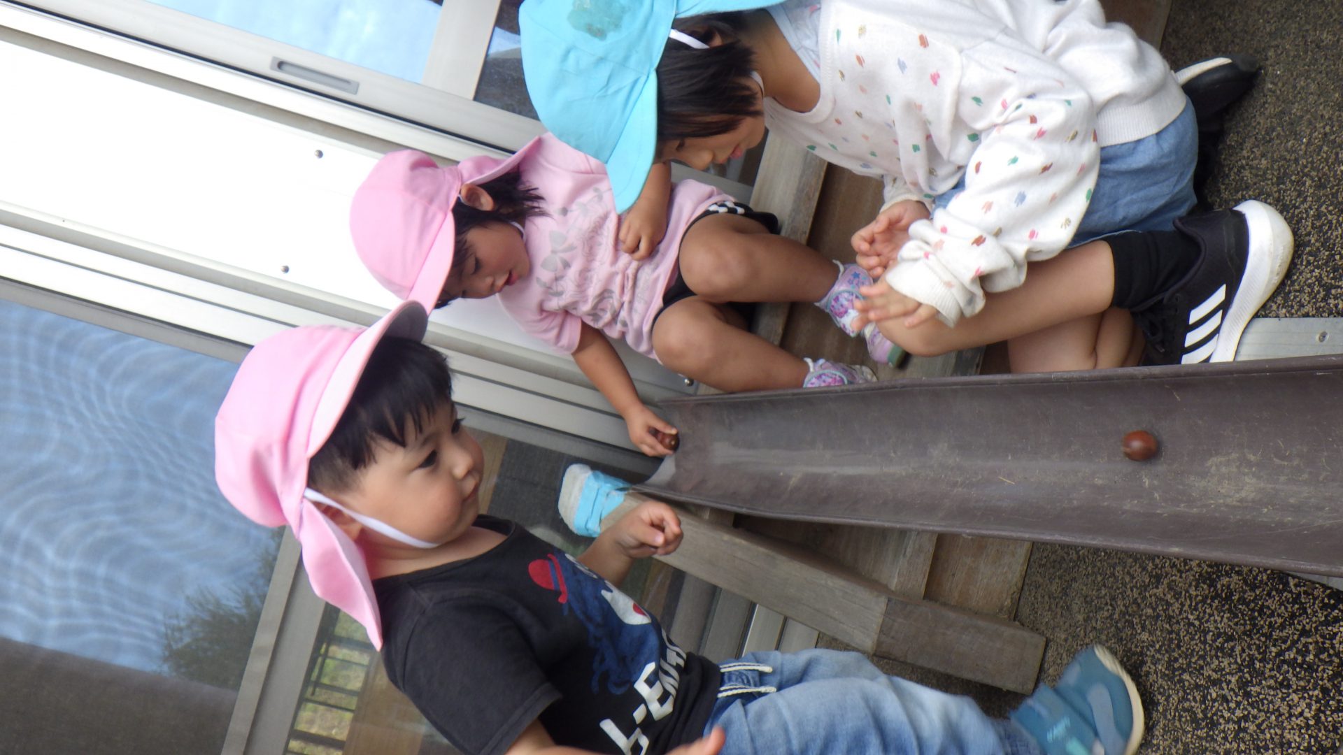 〇年中児の部屋の前にどんぐりを転がして遊べるところを発見‼自分たちの部屋からどんぐりを持ってきて一緒に転がして遊びました。繋げて長いコースを作ってくれたり、転がったどんぐりを拾ってきてくれたり、優しい年中児さん。転がる様子を真剣に見つめています‼