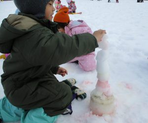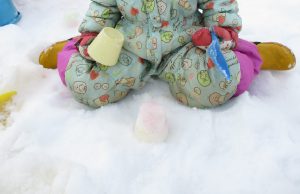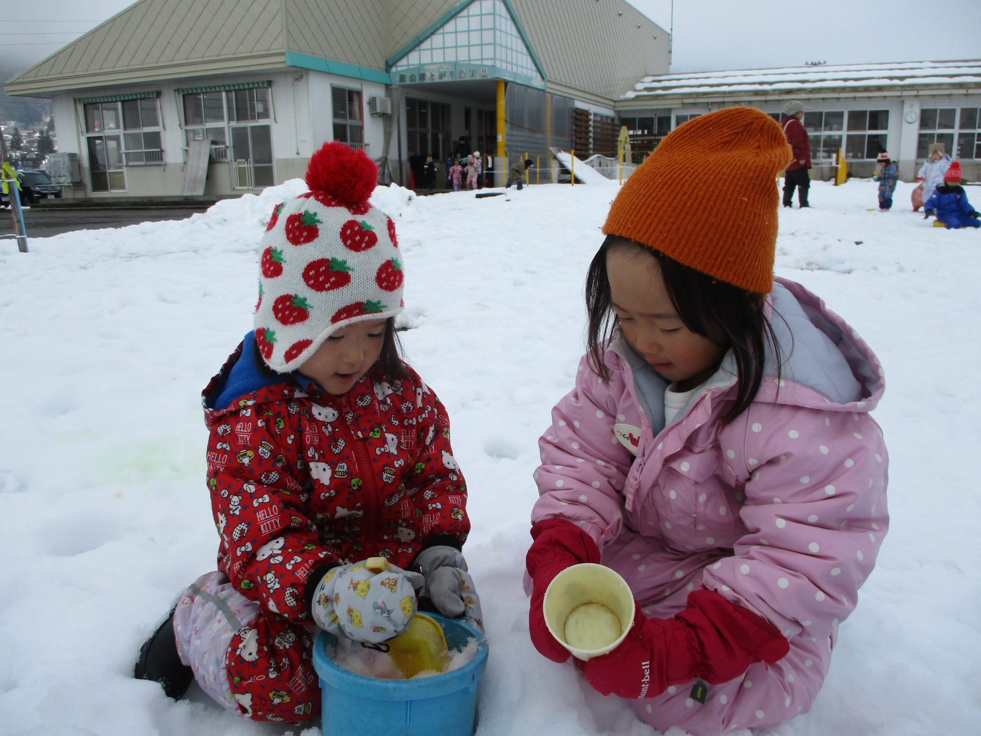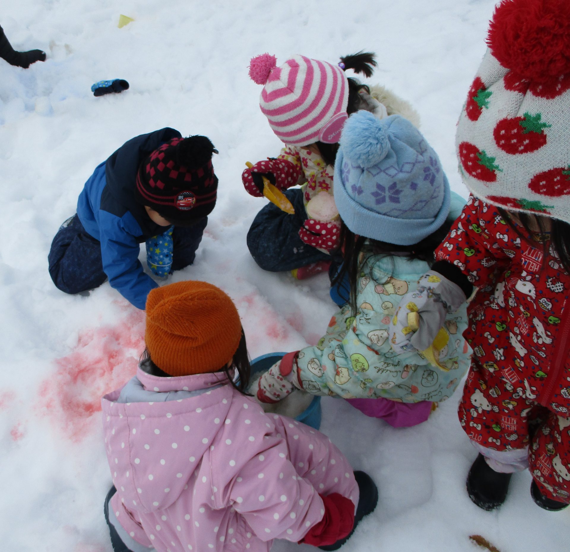 この日は色水を持って雪遊びへ。かきごおりやさんごっこをしました。