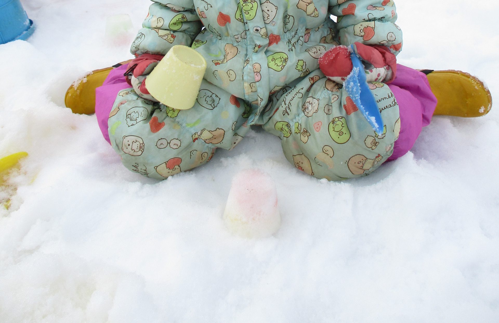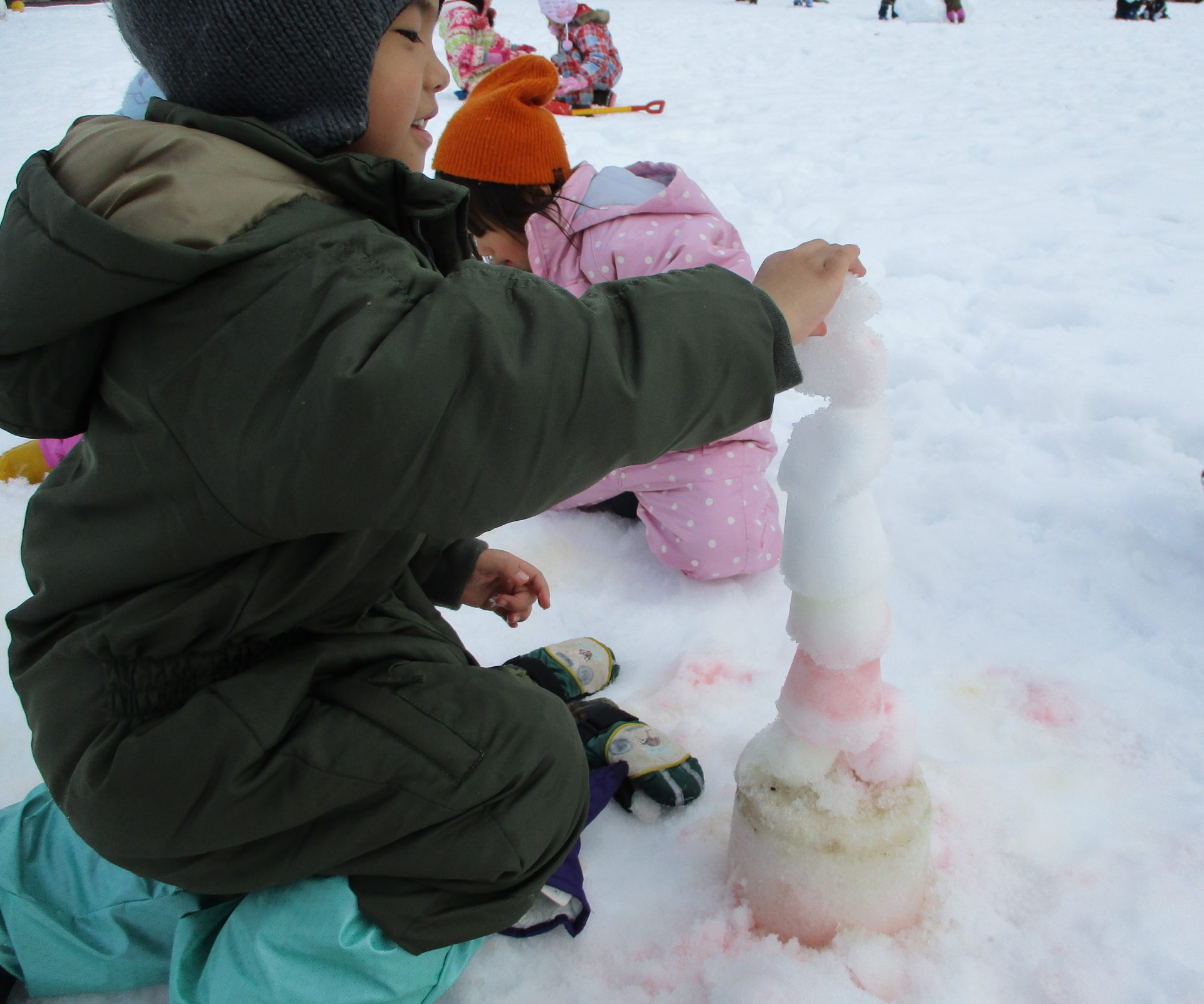 「あか ちょうだい」と、自分のカップに色のついた雪を入れて混ぜて楽しみました。