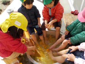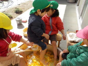 遊びに使っていたみかんの皮の存在を思い出し、タライに投入。