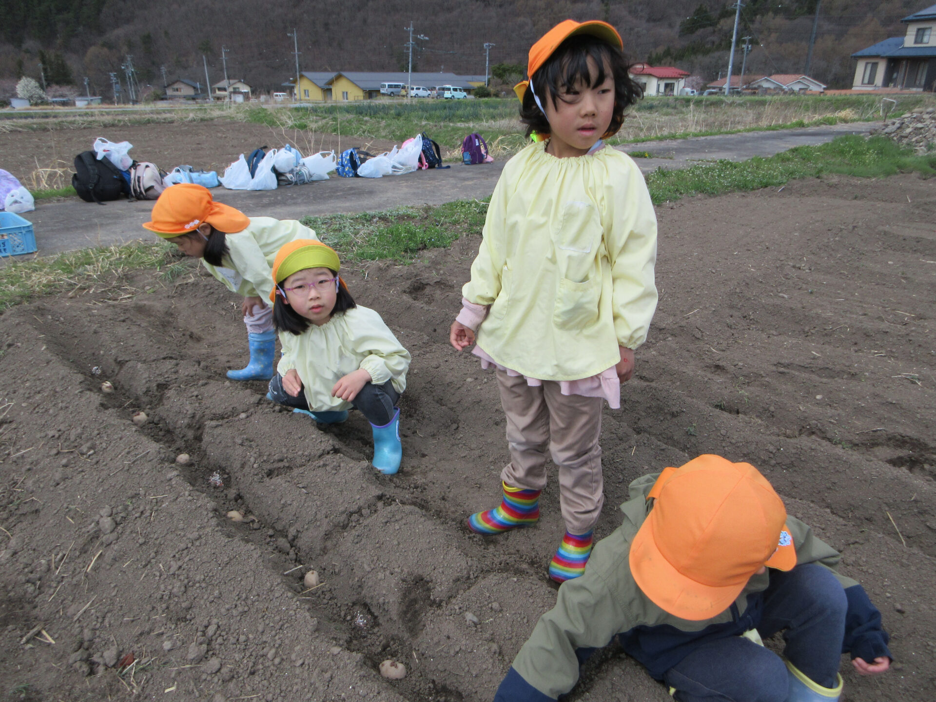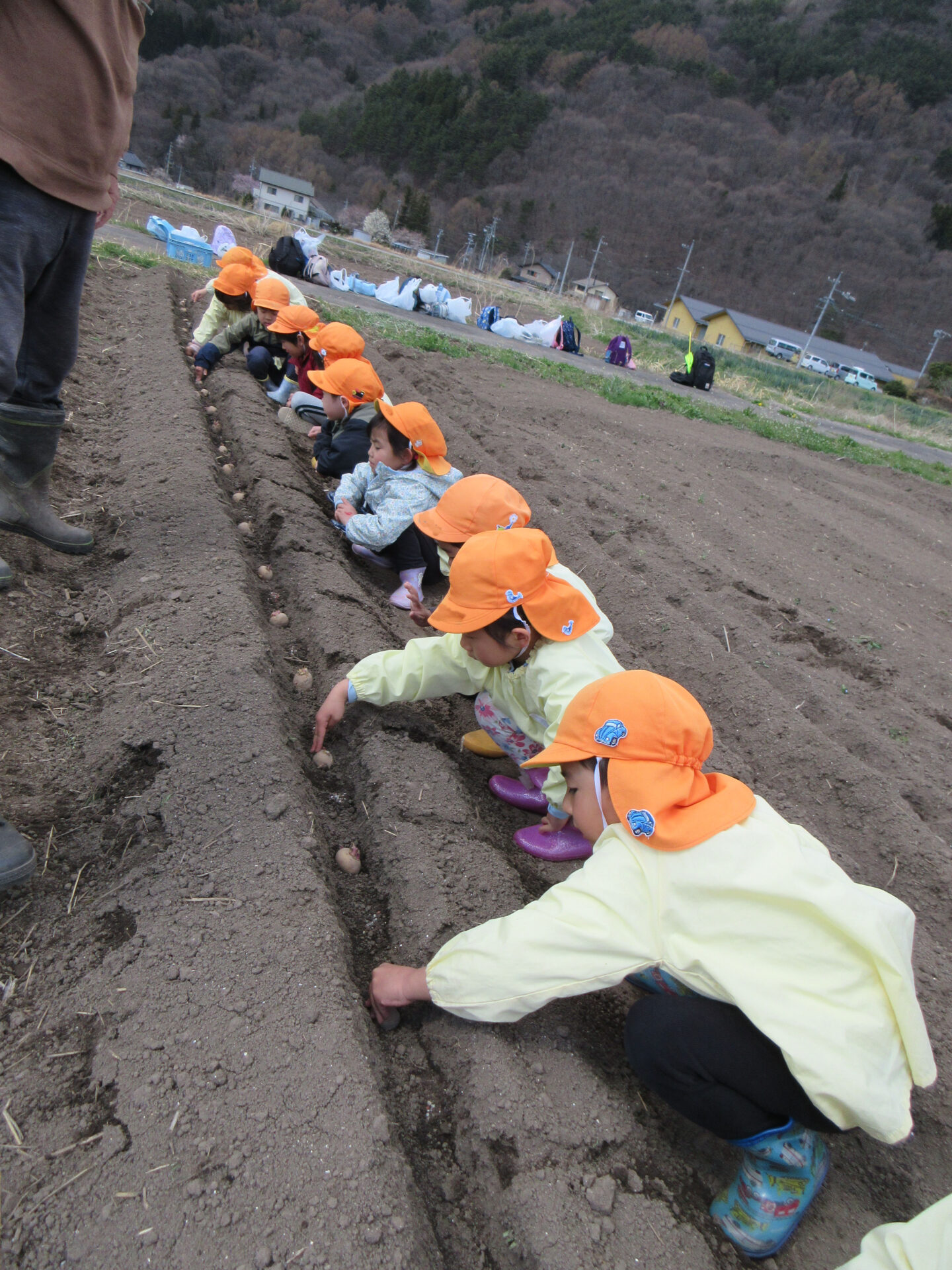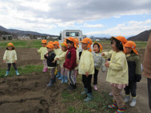 年長さんみんなで幼稚園の畑へ!じゃが芋を植えたよ。