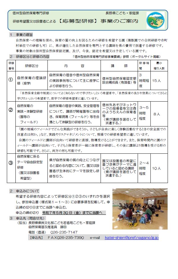 (2) 県では、当研修のほかに、県主催の自然保育研修予定しています。添付の「令和7年度信州型自然保育(信州やまほいく) 県主催研修予定一覧」をご確認ください。研修一覧はこちらから 070502nennkankeikaku