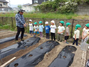 畑で園長先生たちから、植え方を教わり、さぁ、植えてみよう!