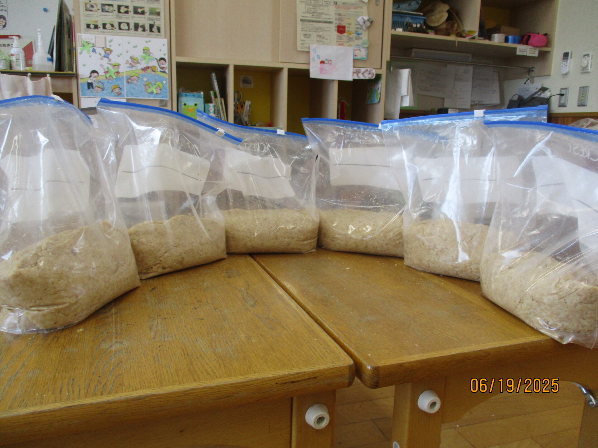 袋に入れて、みそになるのを待ちます。秋には美味しいみそができるといいな!