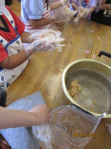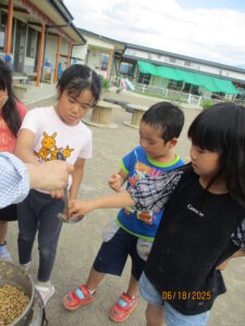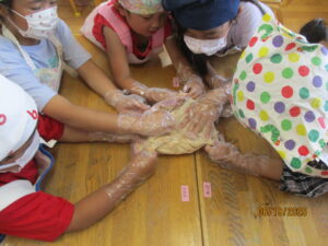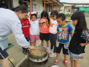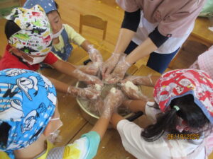 園長先生のお話しをよく聞いて、みんなでモミモミ豆をつぶして混ぜていきます。