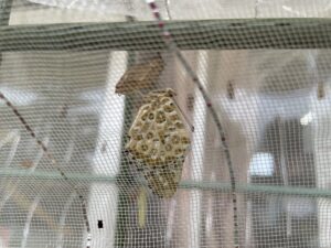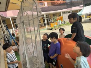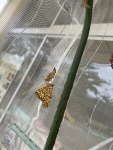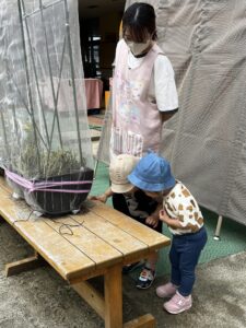 子どもたちは、沢山の虫に興味津々。時々、抜け出した虫がいると「こわ~い」と言いながらもじーと動きを観察していました。保護者の方たちもお迎えの時などに子どもと一緒に中を覗いて、蝶々になるのを楽しみにしていました。