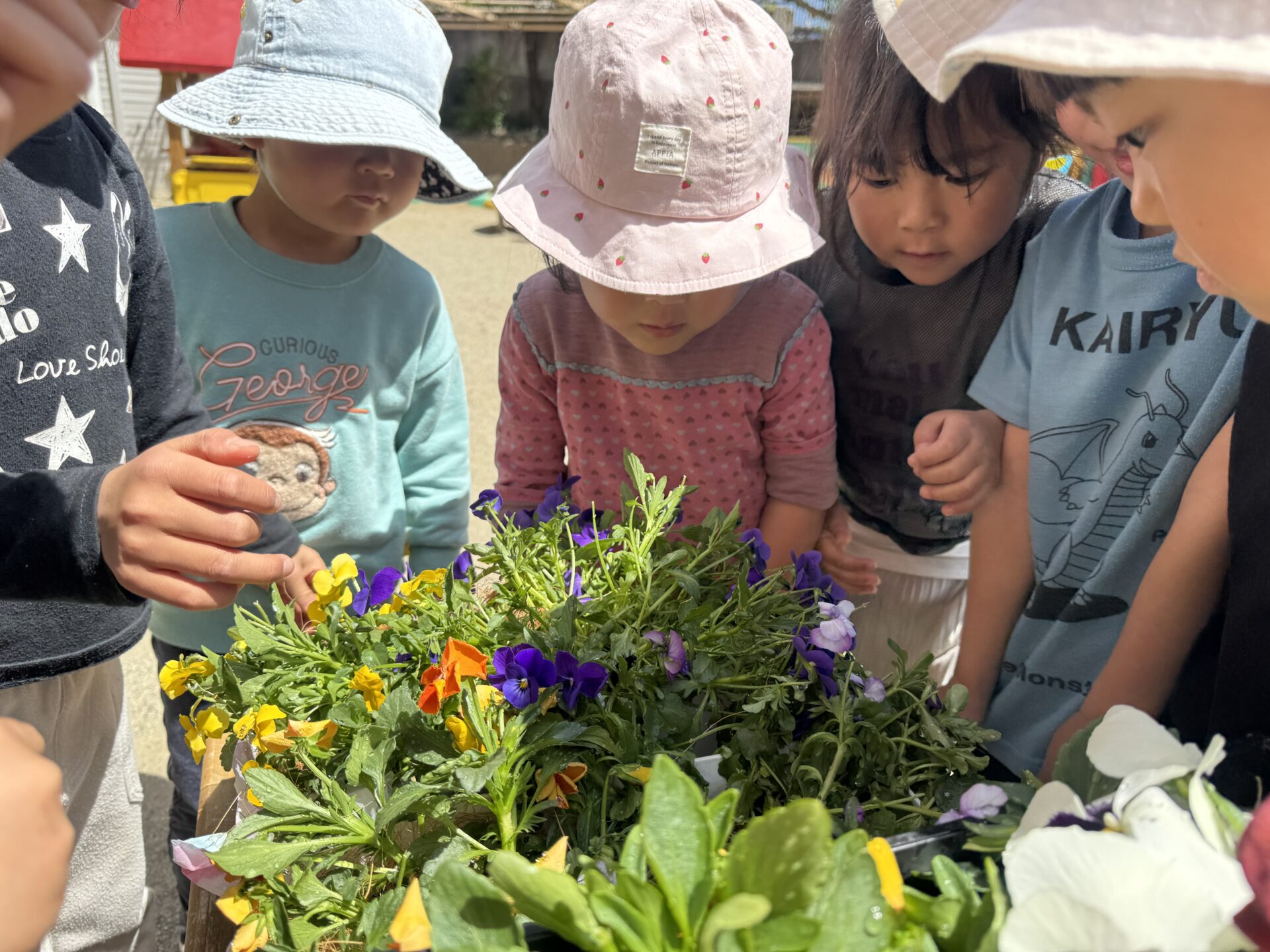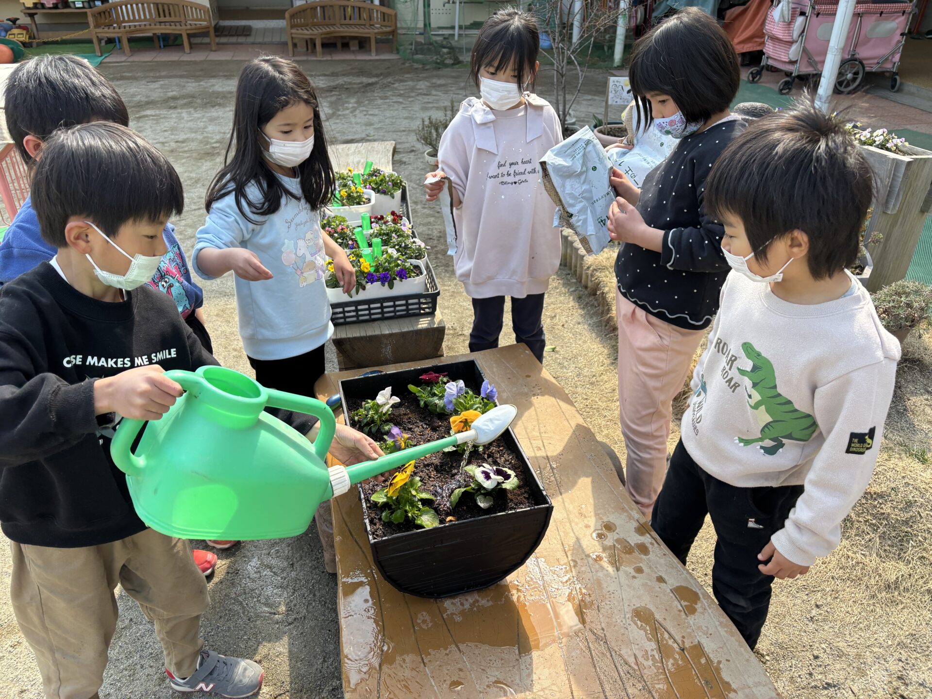 昨年度の年長児が、卒園記念にパンジーを植えてくれました。そこへやってきたのは・・・