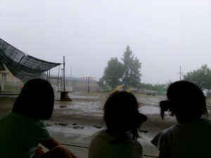 時には、大雨にドキドキ。空が黒くなってきた!風もすごいね!