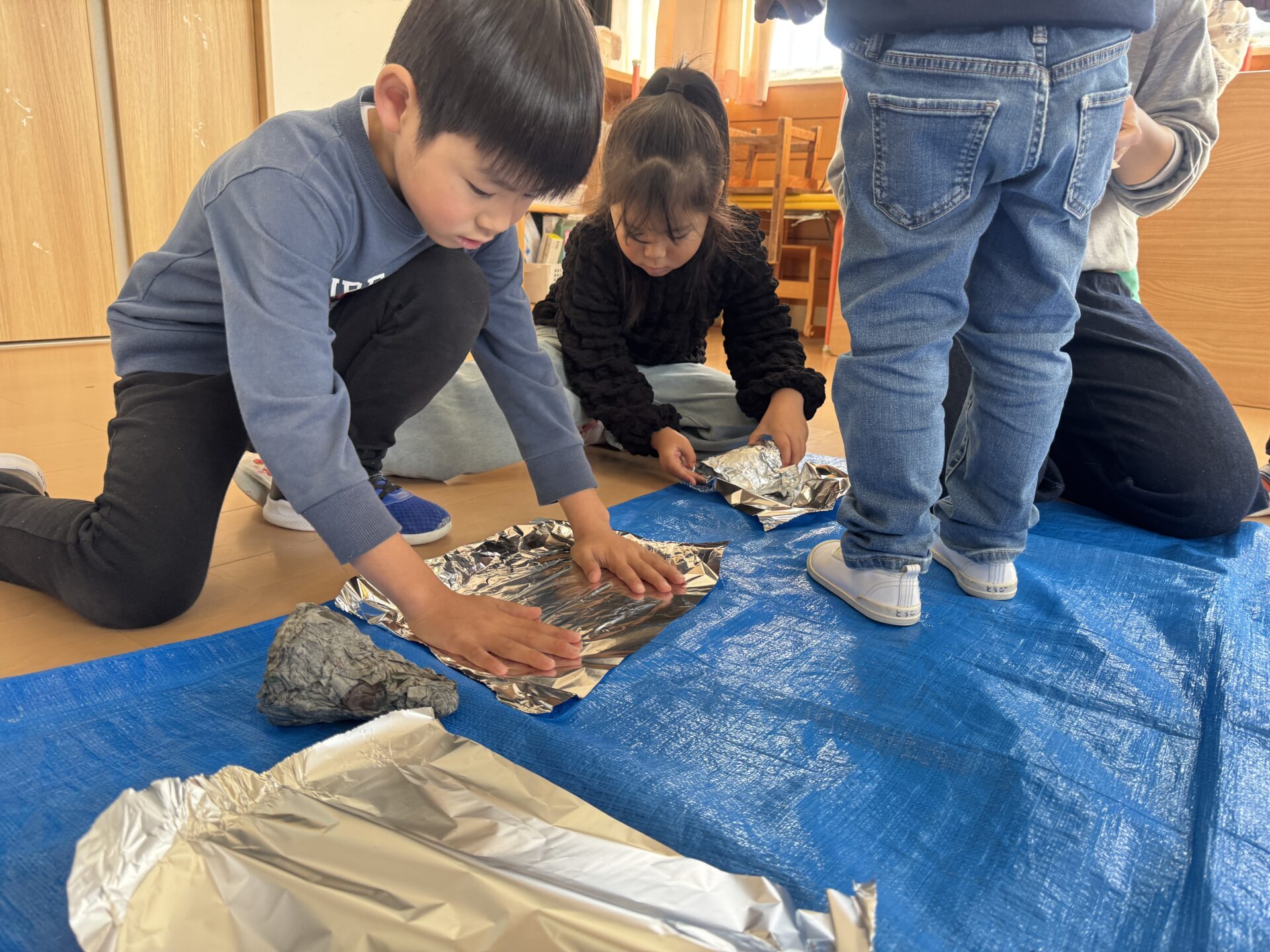 年中さんと年少さんは焼きいもの準備です。「どうして新聞を水に濡らしちゃうの?」「ちゃんと巻かないと燃えちゃう」と新聞やアルミホイルで包む意味を考える姿も。「うまく巻けない…」と苦戦しながらも食べたい気持ちを胸に頑張っていました。