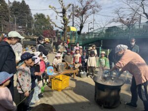 完成した芋煮は地域の方々と机を囲んでいただきます。いろいろなお話に花を咲かせながら、美味しくいただきました。地域の方々とも素敵な交流の時間になったね。