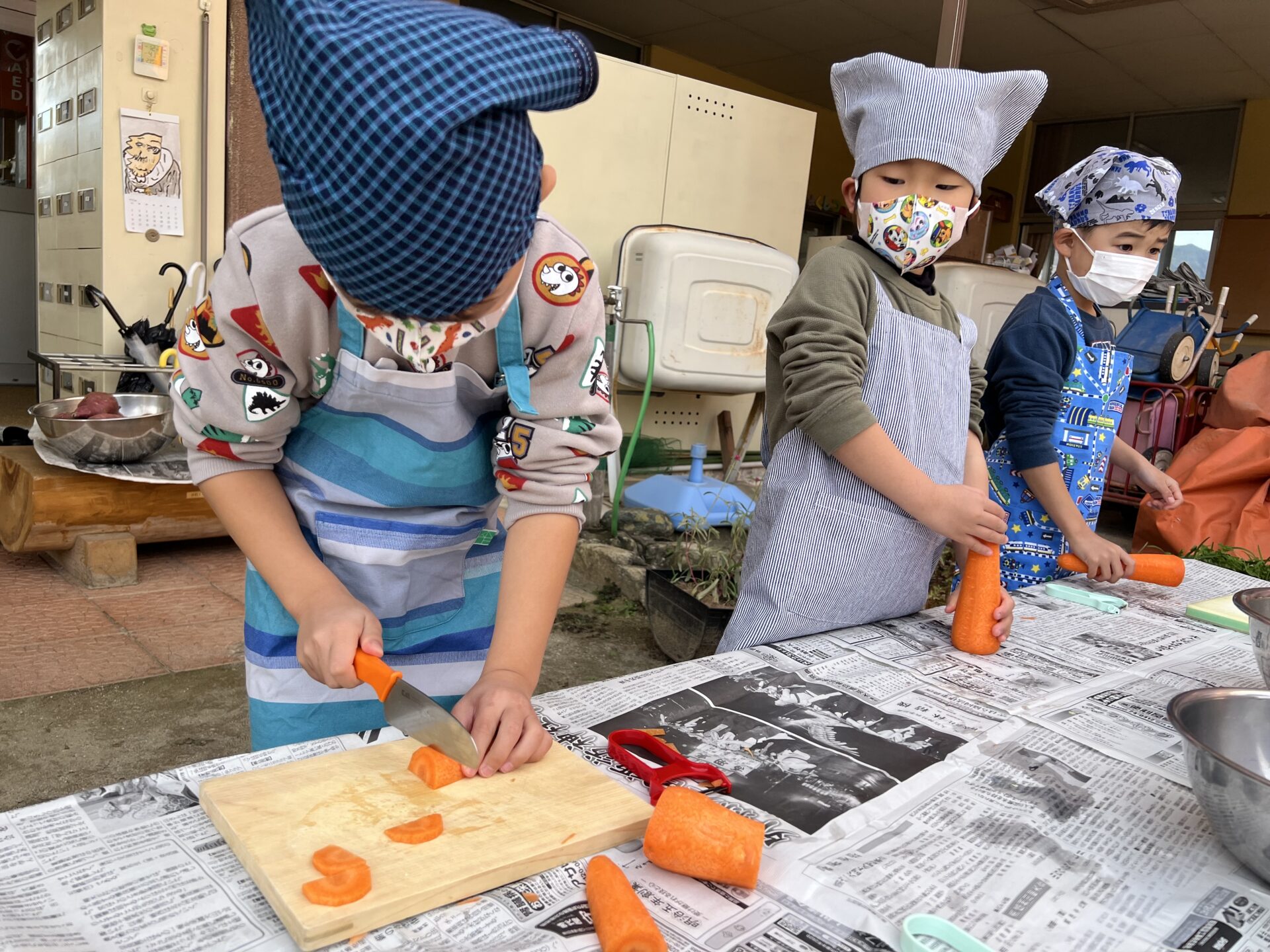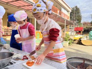 年長さんは自分たちで買ってきた野菜や育てたさつまいもを切ります。以前の調理体験の経験から「ねこの手で切るんだよね」と話しながら慎重に切っていました。