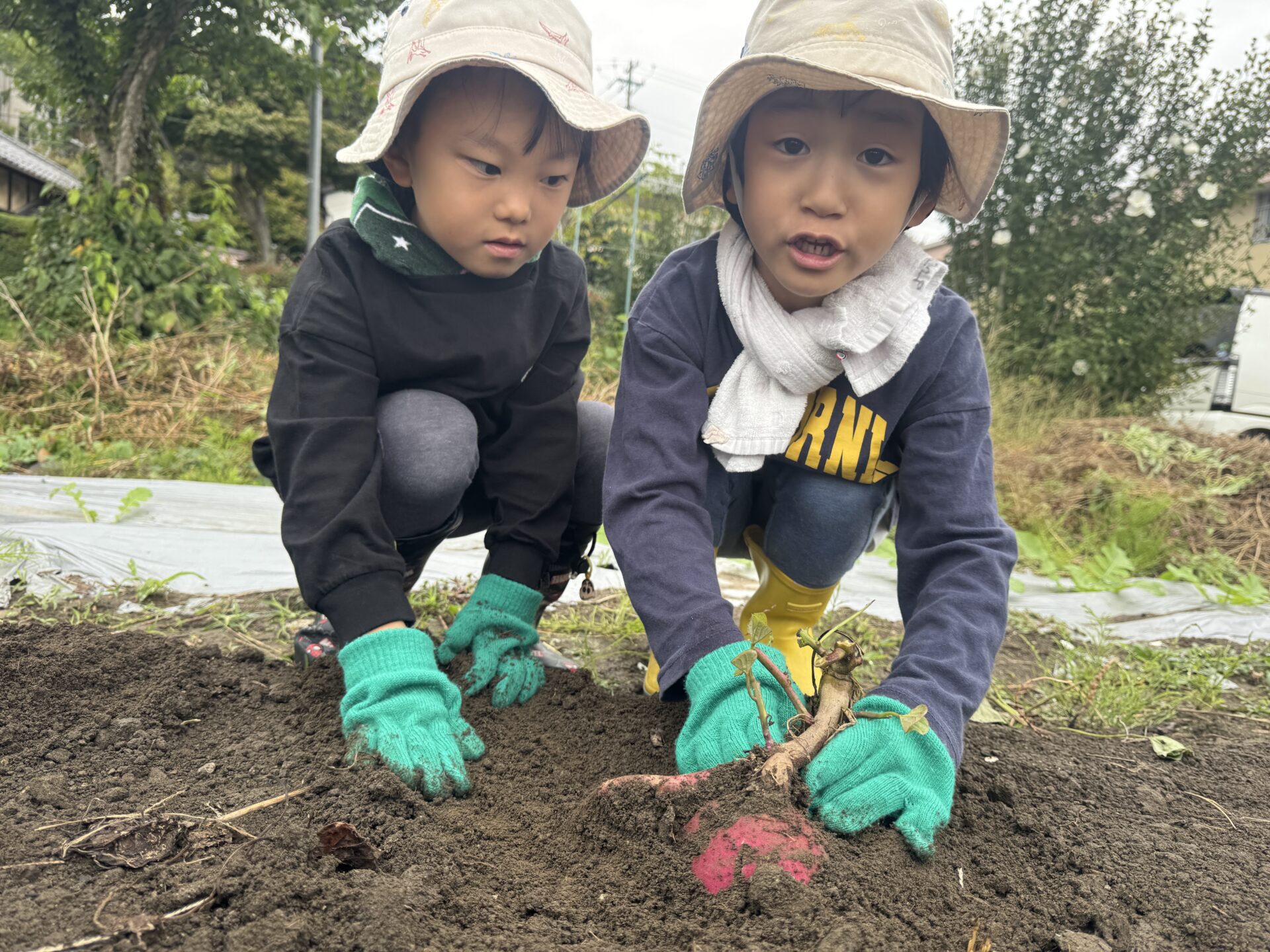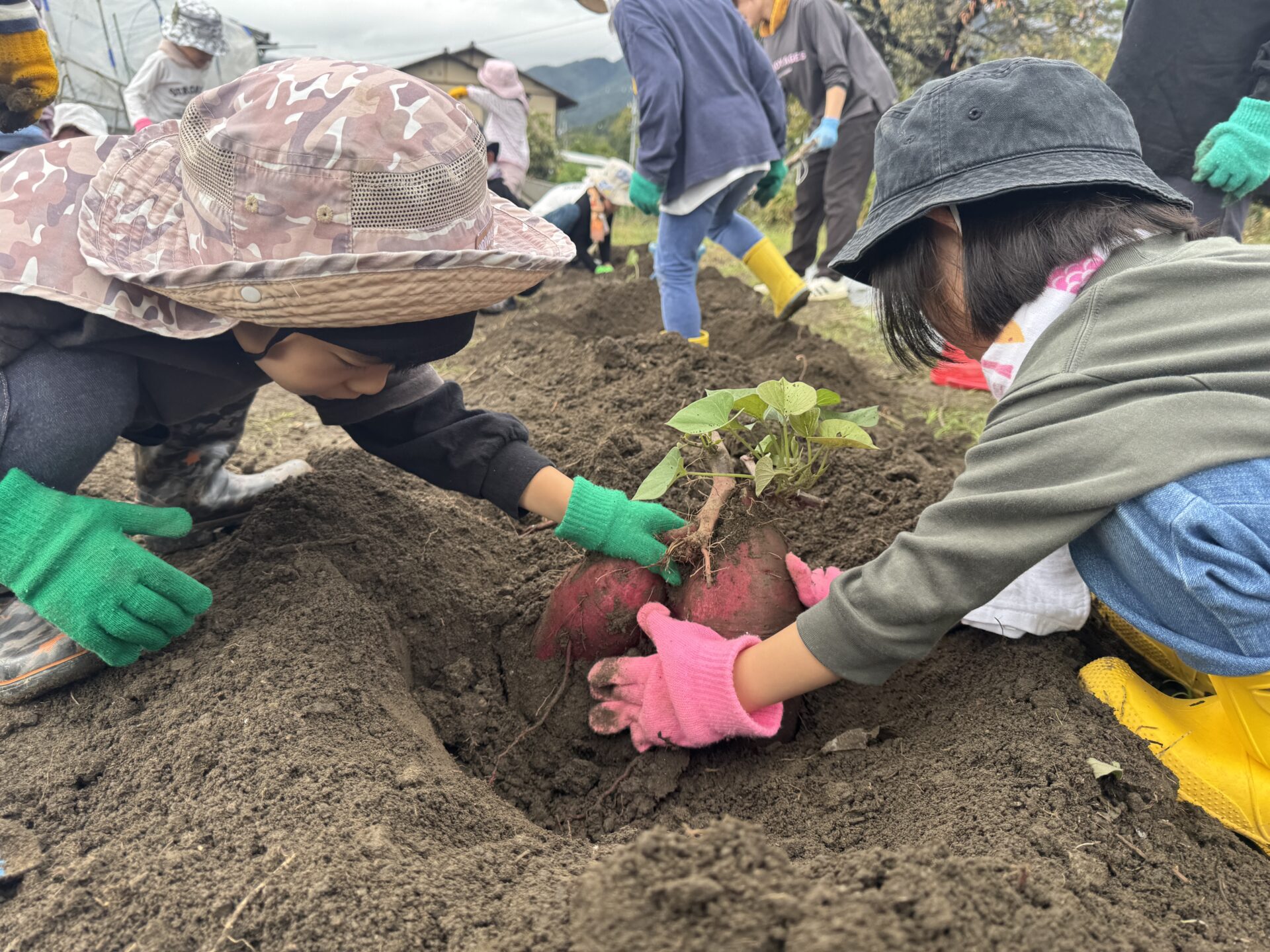 「折れないようにするんだよ」「さつまいものお尻が見えるまで掘らなきゃ」「引っ張ると千切れちゃうからね!」「もっとそっちも掘ってよ〜」「大きすぎて掘りきれないよ…手伝って〜!」