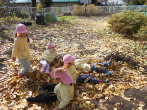園庭の木々の紅葉が鮮やかに彩ったあと、たくさんの落ち葉。