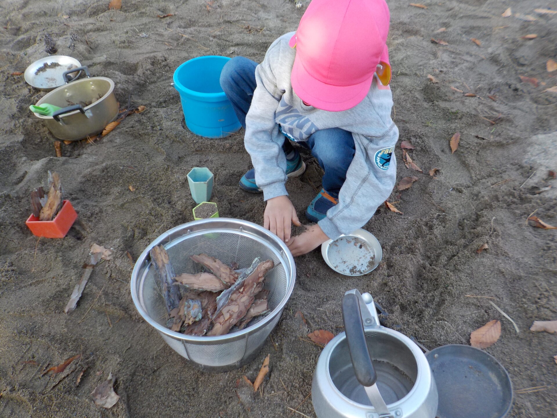 「こっちにたくさん木の枝があるよ」「こっちには木の実があるよ」といろいろな物を探しています。