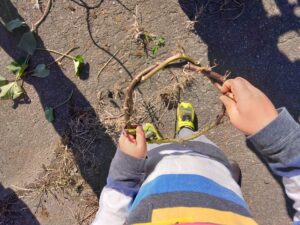 初夏に植えたさつまいもの苗が暑い夏を経て生長し、年長児と年中児で楽しみしていたさつまいも掘りをしました。自分たちで育てた芋を見つけると、「ここにあるよー!」「周りの土を掘ろう」と、芋を傷つけないように優しく周りの土をどけながら掘ろうとする姿や、「このおいも、大きそう!一緒に掘ろうよ!」と友達と協力しあって掘っている姿がありました。
