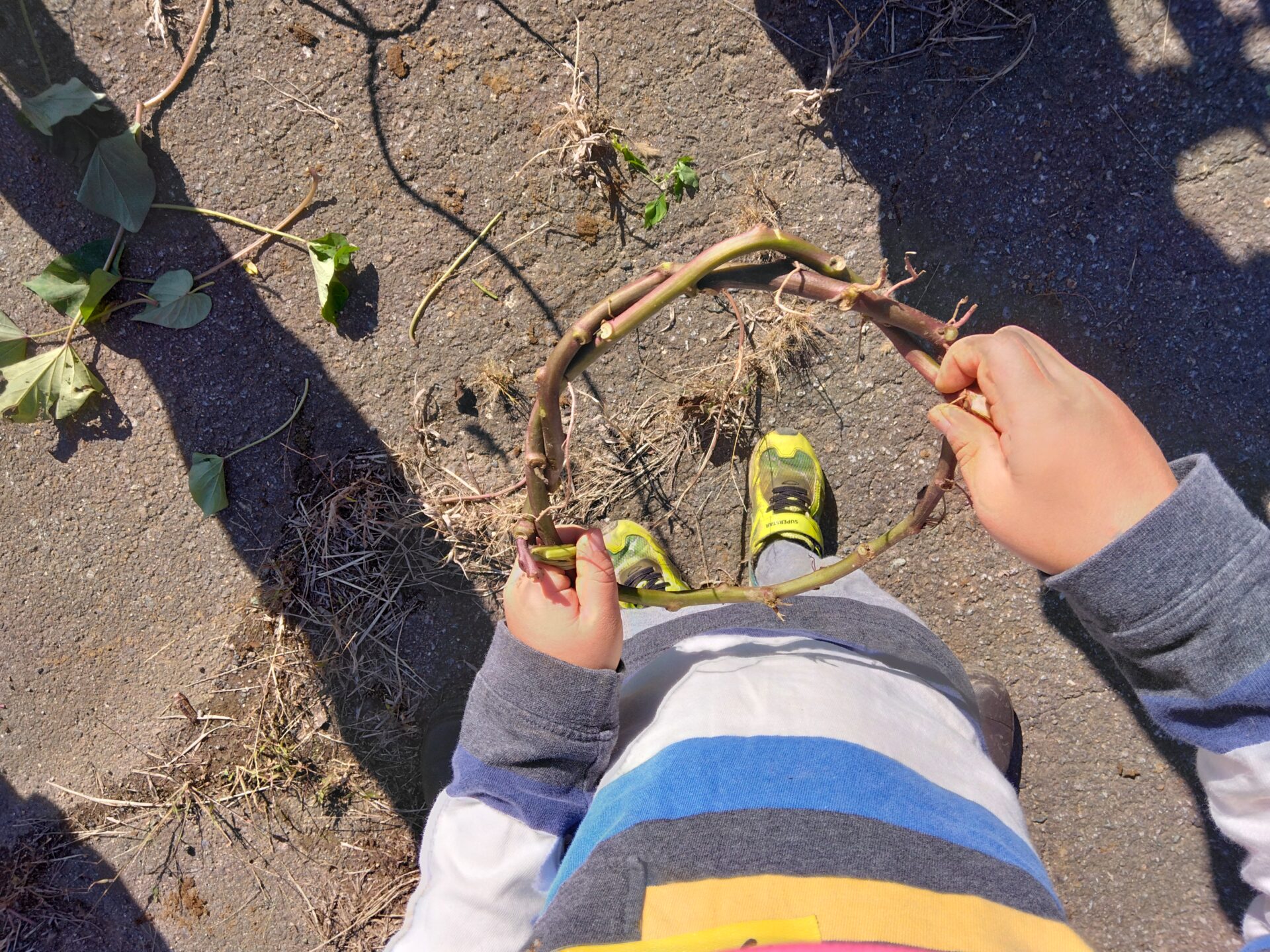 そして、芋掘りの後には芋のつるを使って、クリスマスリースの土台を作りました。数日間、干して乾燥させた後、どんぐりやドライフラワーを飾り付け、素敵なクリスマスリースが完成しました。
