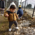 地面いっぱいに広がる霜柱をそっと踏んでみたり、ジャンプしたり、手で押してみたりと夢中になって遊んでいました。
