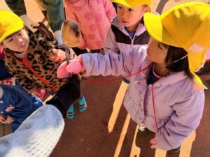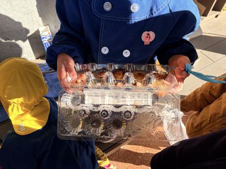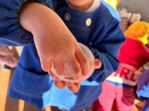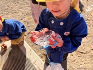 前日に水を入れ、毎日「凍ったかな?」と見ていた子どもたち!この日は、やっと凍った氷に大喜びしました。入れた容器の形のまま凍った様子を見て、お気に入りの氷ができた子も!