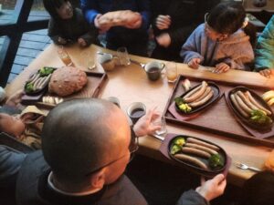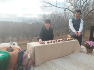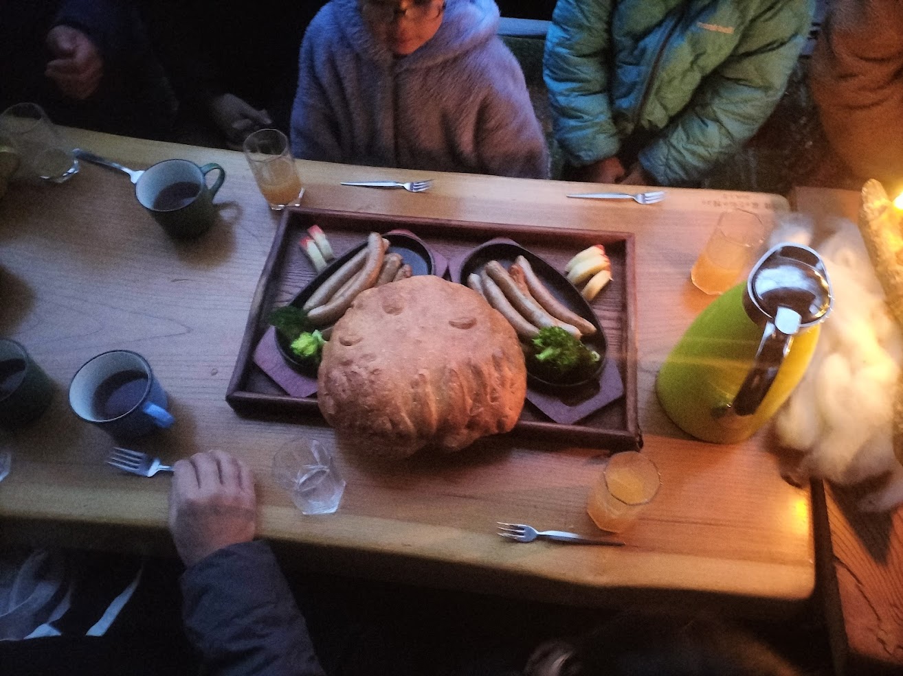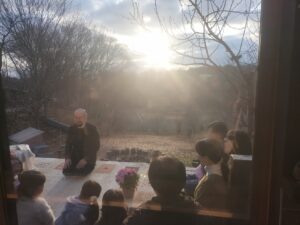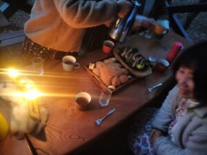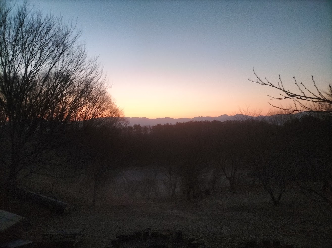 巣立ちの会(世に言う卒業式)。未来への希望願いを含め、朝のエネルギーで門出を祝おうと、日の出時刻6時13分に照準を合わせる。この日も、心を込めて3時から会場準備。かがり火 ろうそく あんどんなどを準備し、朝食は 卒業生の顔パンを焼き、大地の給食でナンバーワンの人気の石窯手作り無添加ソーセージを準備した。5時15分、かがり火で灯された大地に 卒業生家族が訪れ、5本のろうそく(5歳)が灯されたテーブルに着席。6歳の6本目のろうそくが灯された中、皆で大地のリンゴジュースで乾杯。手作り紙すき卒業証書及び記念プレート、そして 焼きたて湯気にでている朝食がプレゼントされた。その後、日の出の時間と共に、保護者夫婦から、お話がプレゼント。その後、早朝の大地周辺を、思い出の田んぼや土手や雑木林を1時間以上親子でスタッフと共に散歩して、いつもと変わらない大地を楽しんで終了。