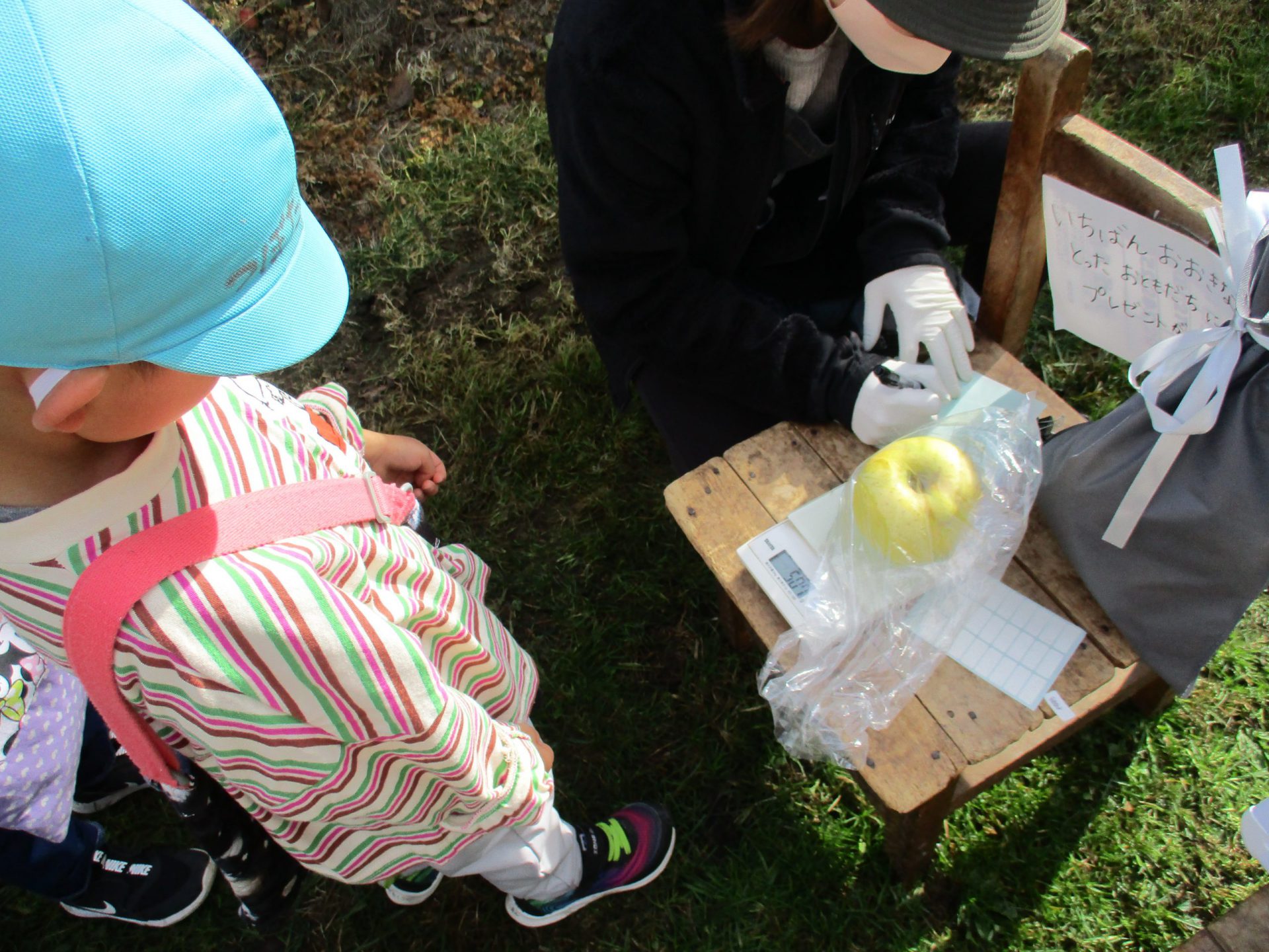 そして・・・最後に重さ比べをして、1番大きなりんごをとったお友達には、りんご園からのプレゼントがあることを知った子ども達は「よ〜し!がんばるぞ〜!!」と気合十分でした。
