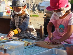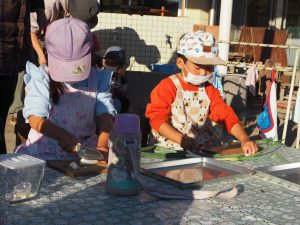 デザートの焼きマシュマロに使う竹串作り。ナイフで竹を削ります。どの子も真剣に。
