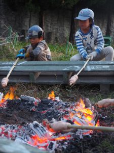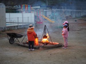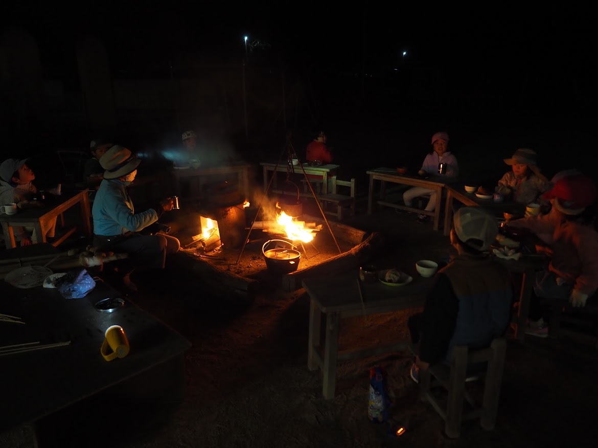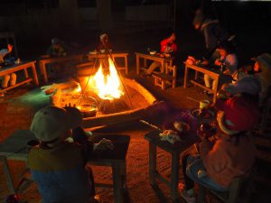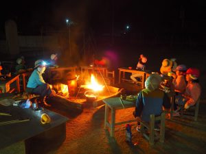 準備ができた子から順々に焚火の周りに集まり始めました。太陽はまだ山の中・・