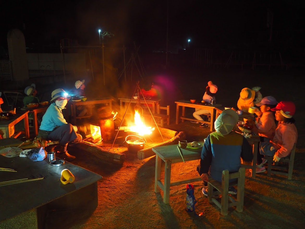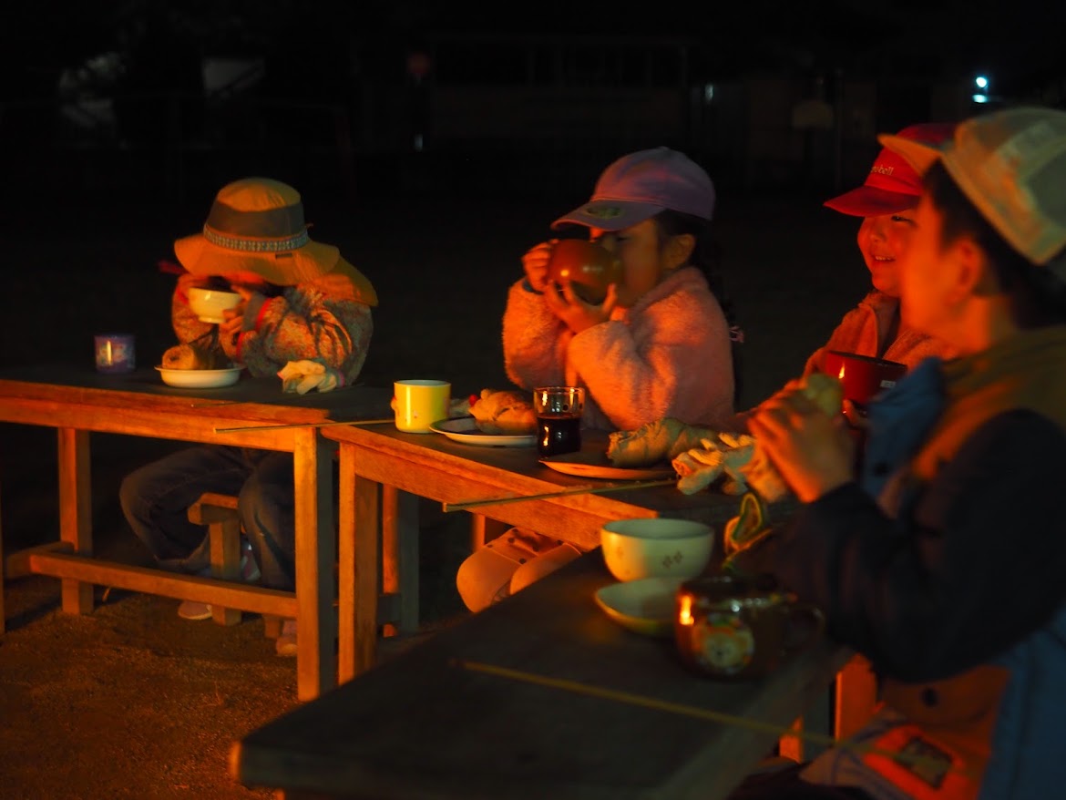 歯磨きをした後は、ナイトウォーク。暗い道を数メートルですが、1人で歩いてみたり、コオロギの声が聞こえたところをライトで見たり、木の葉っぱが昼間とは違う色に見えることに気付いたり、影が長かったり・・・。昼間とは違う闇の体験をしました。