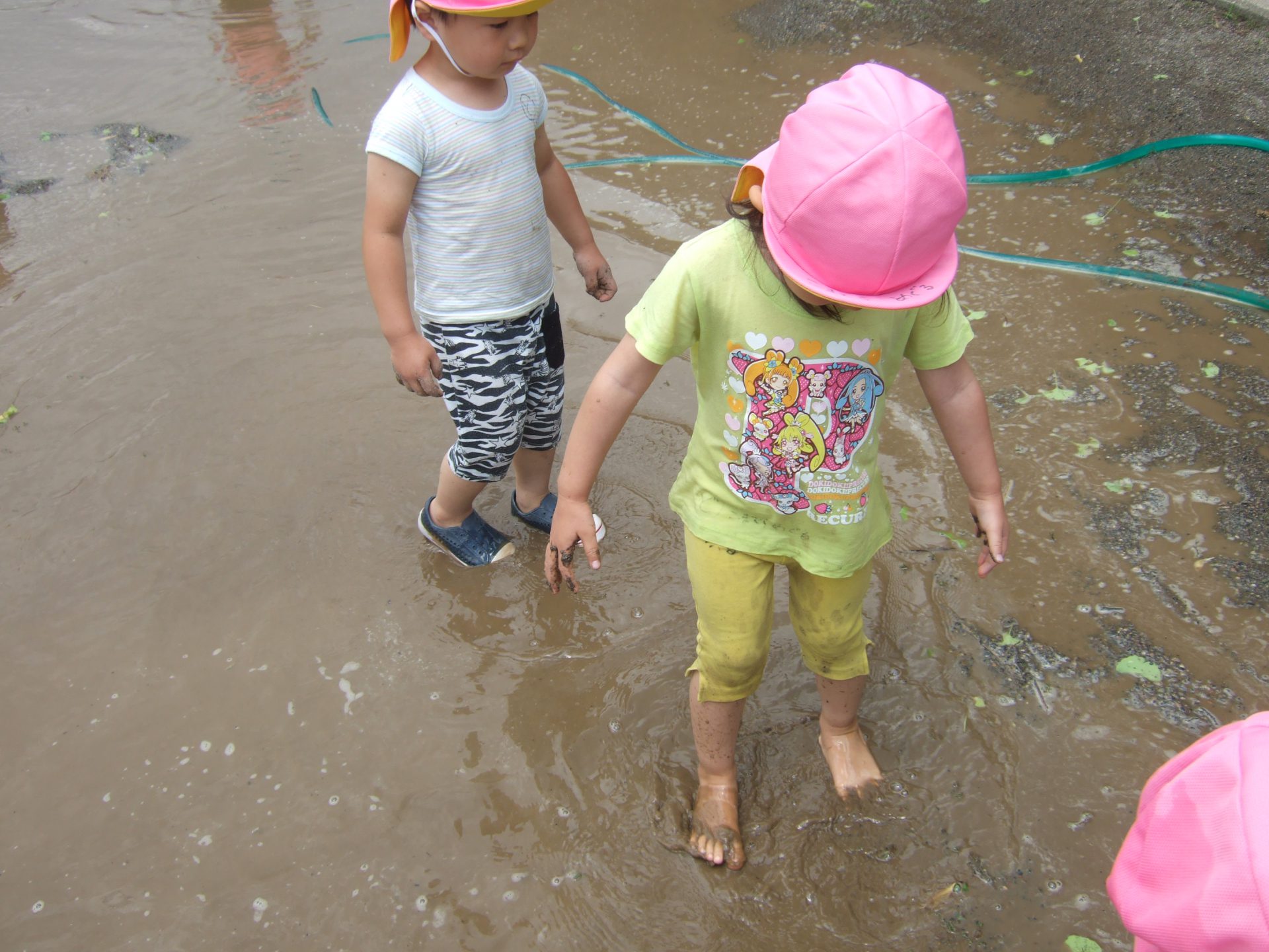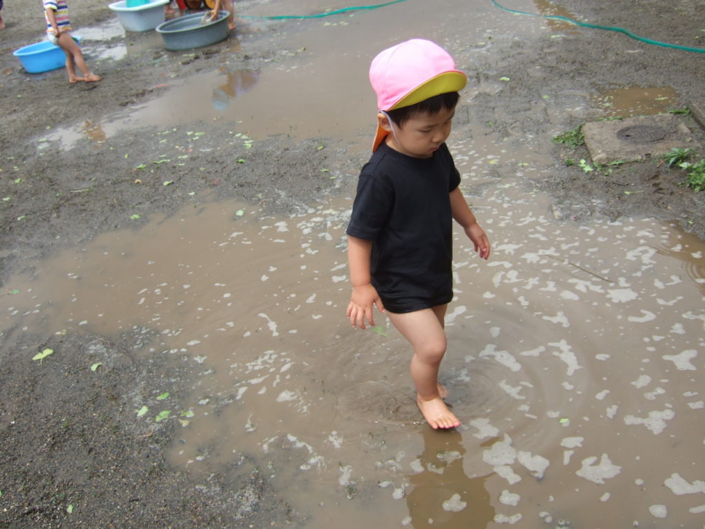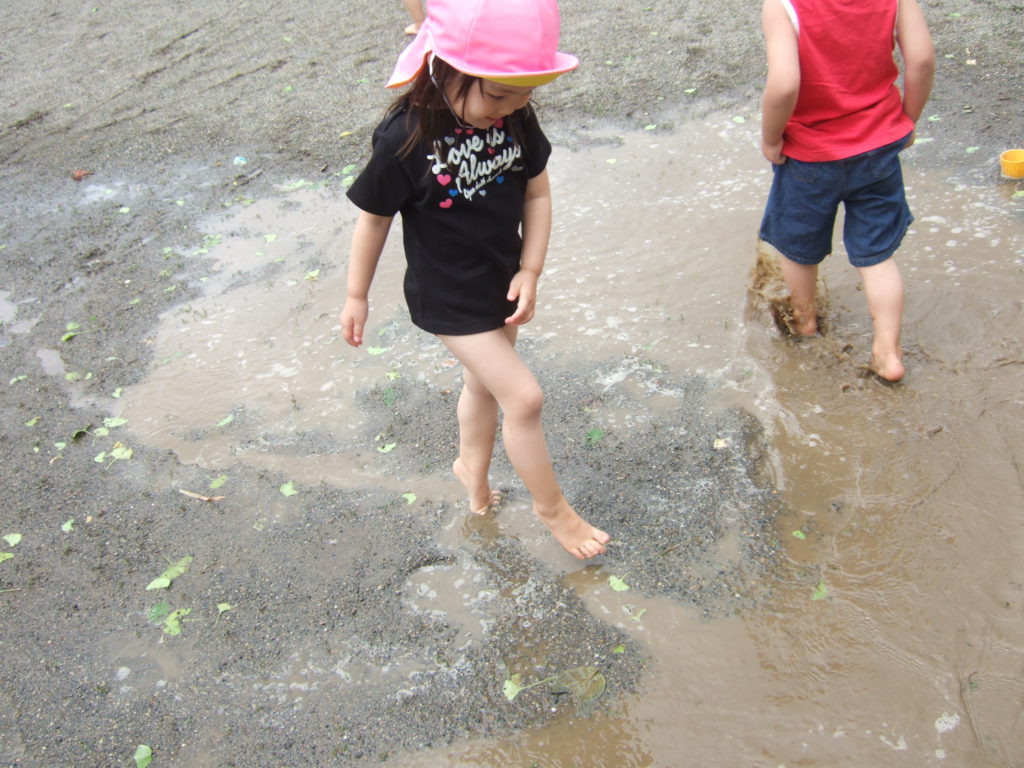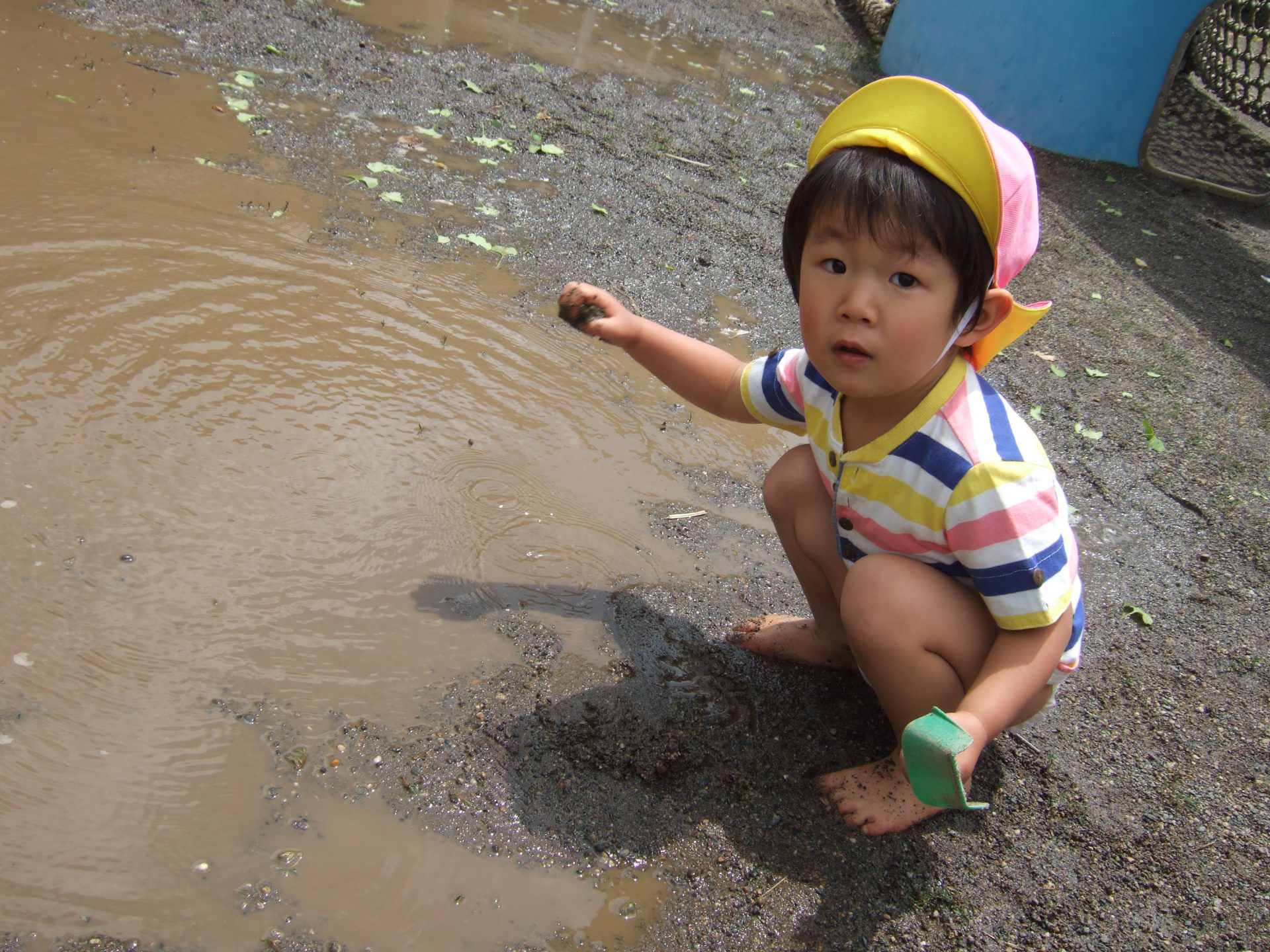 これまでにも何度かどろんこ遊びをしてきましたが、この日お外に出ると大きな水たまりがありました。