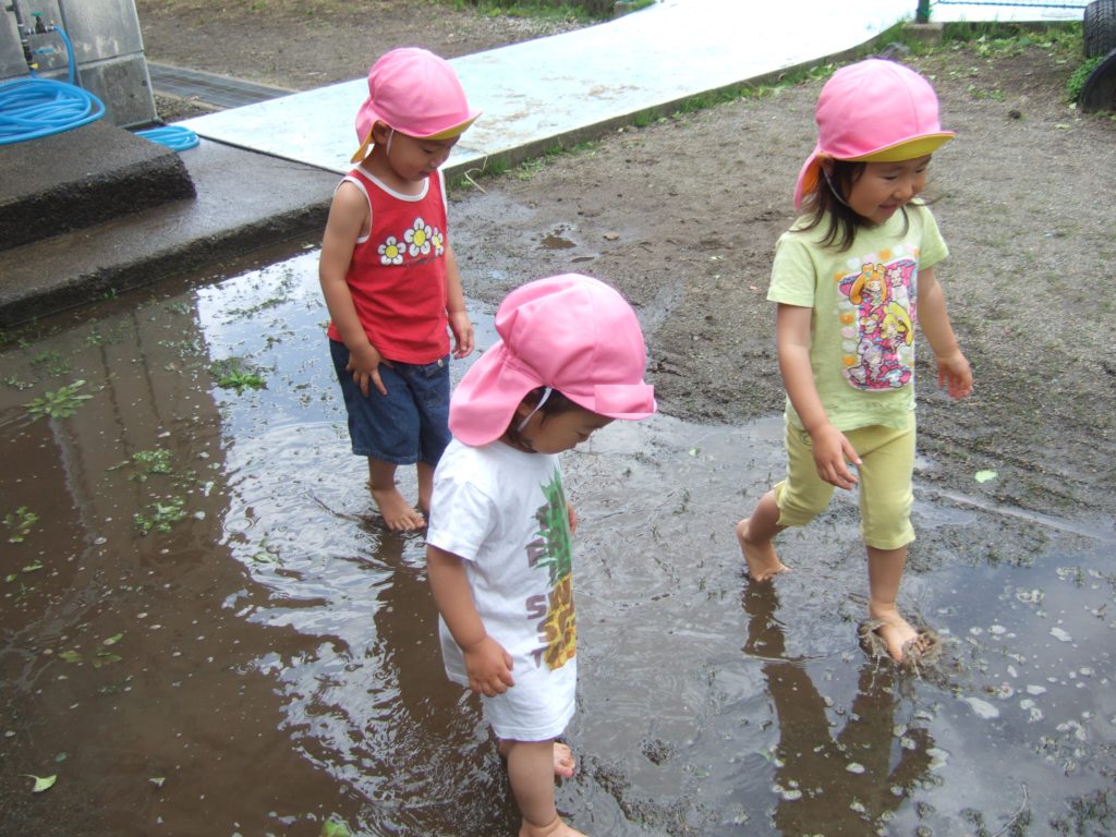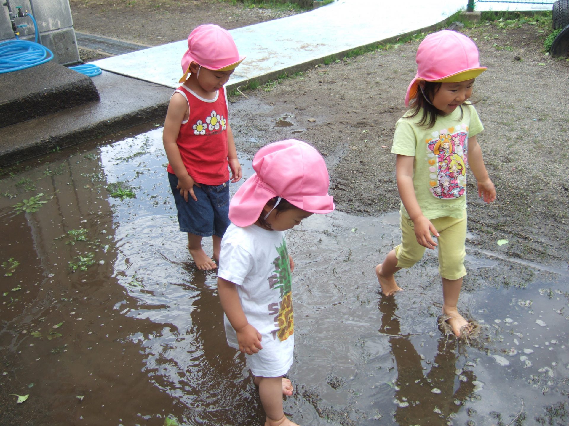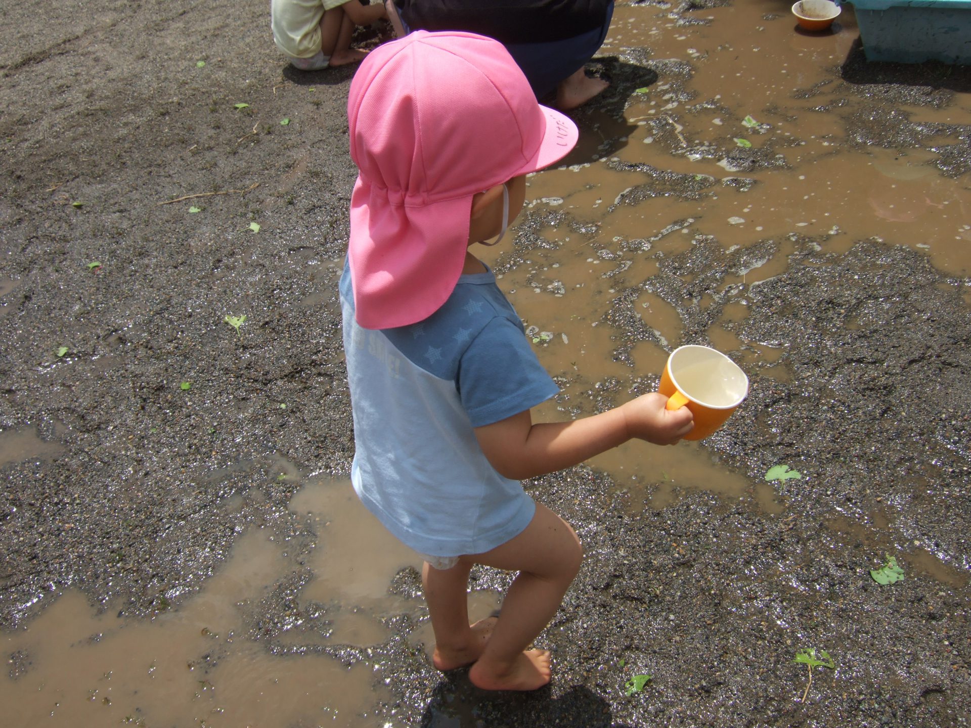 これまでにも何度かどろんこ遊びをしてきましたが、この日お外に出ると大きな水たまりがありました。