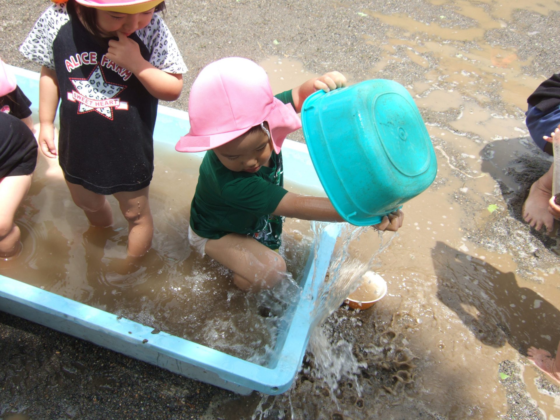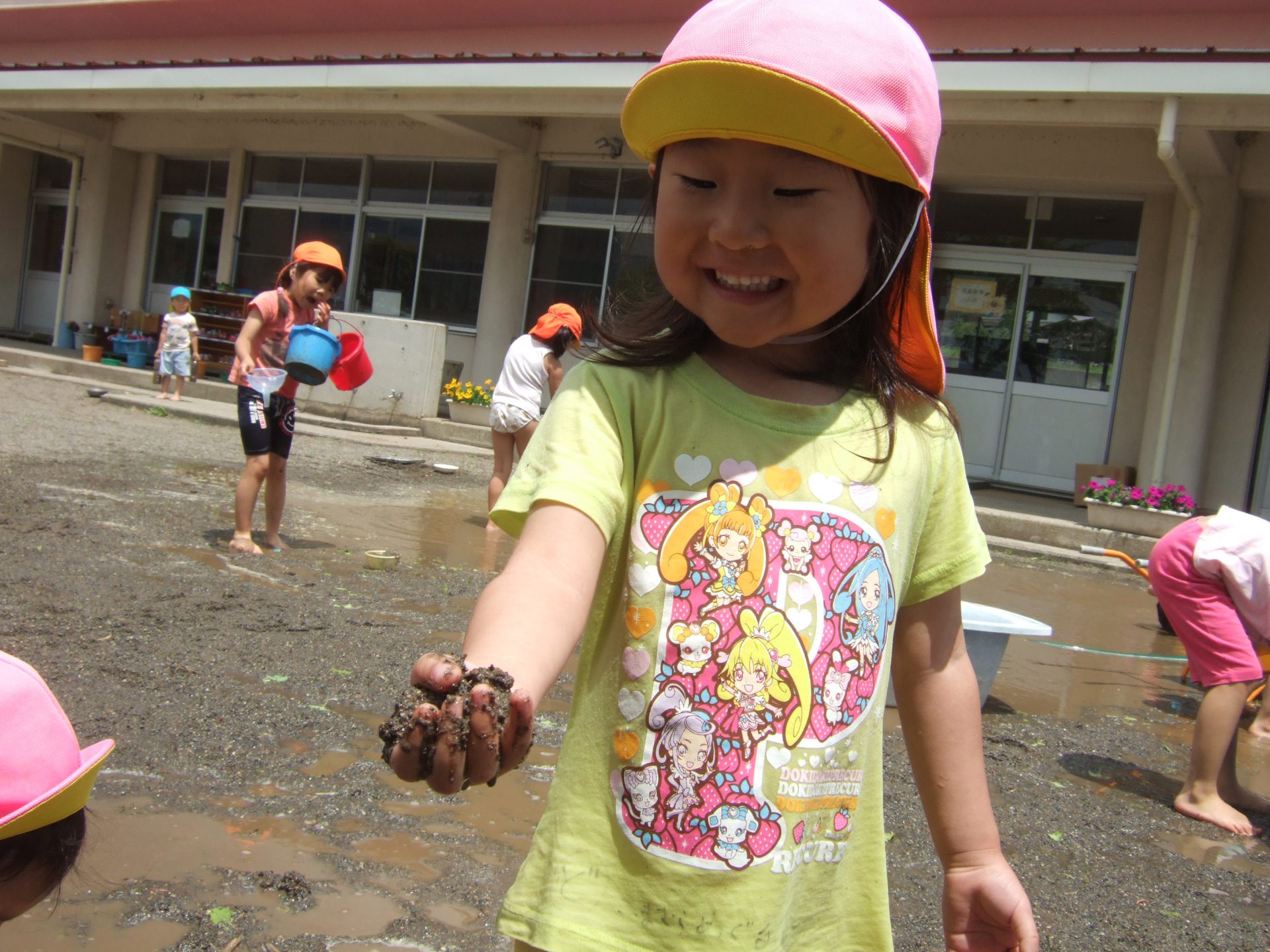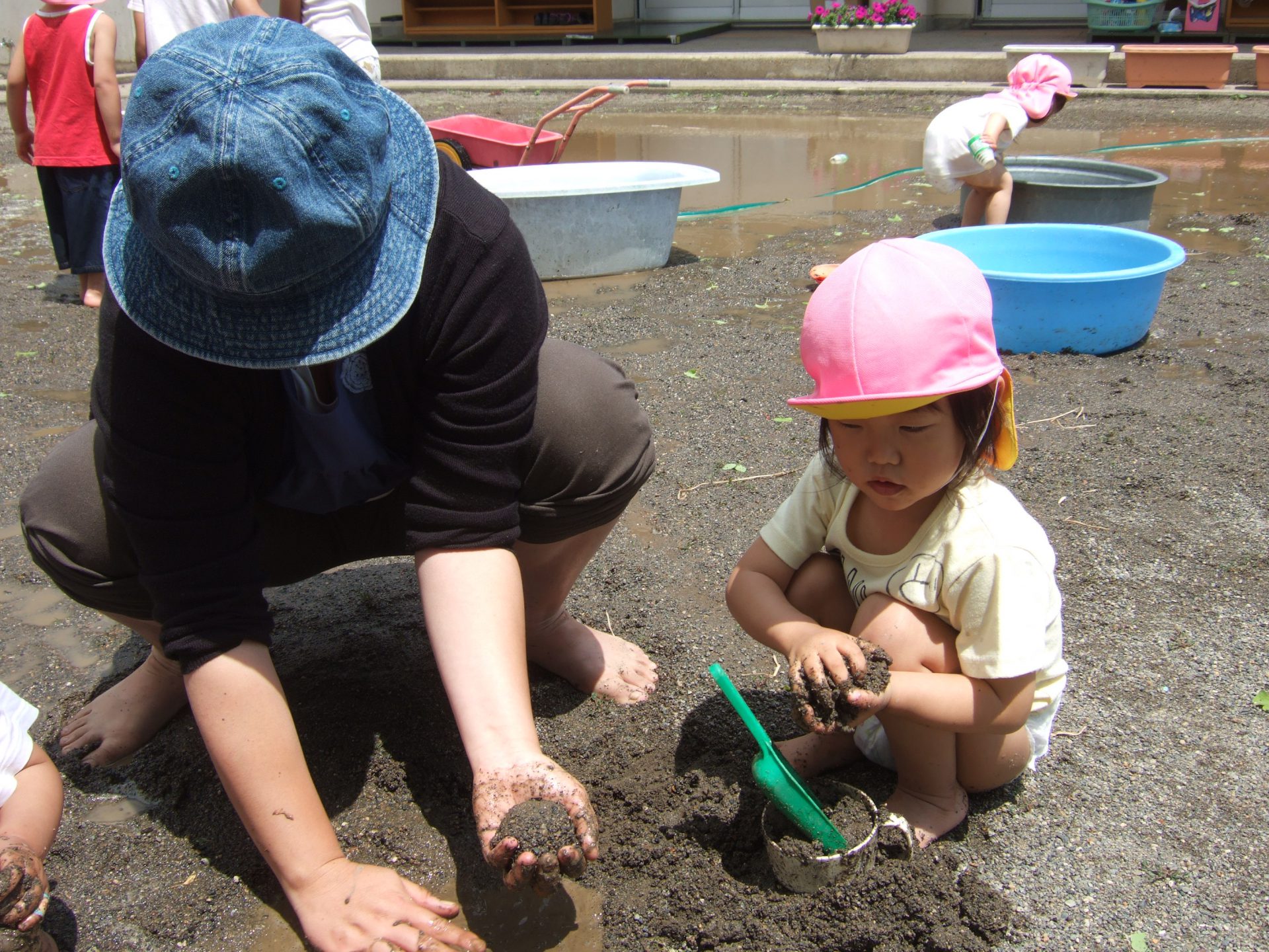 一人ひとり自分の好きなところで遊んで楽しんでいる泥んこ遊び。これからも、砂、泥、水、に十分に触れながら、発見や心が動く経験を得られるようにしていきたいです。