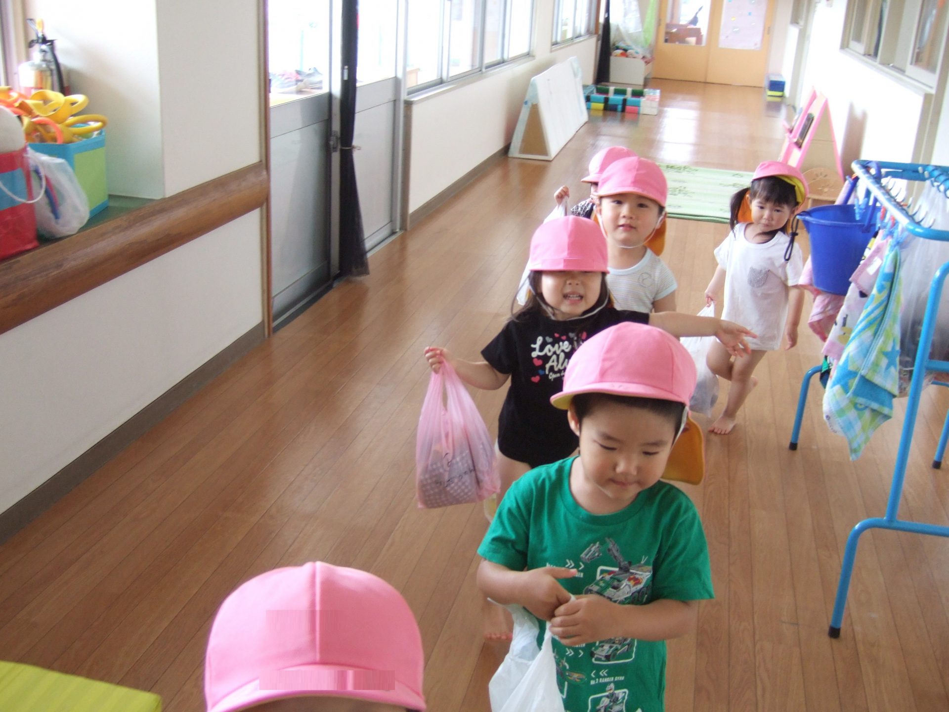 泥んこの服に着替えてお外に向かう子ども達。自分のお着替えを持って出発!