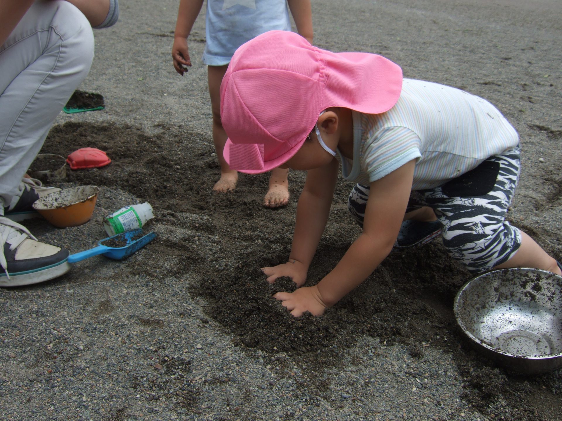 砂にお水をかけてこねこねケーキ作り。力強く握った土の感触はどうかな?