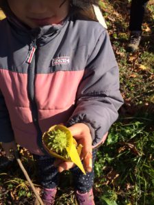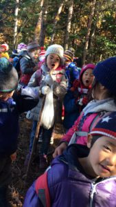 山の頂上でお昼を食べてから下山し、最初に寄った駐車場下のモミジバフウのところへ。朝よりも青空が濃くなり紅葉がより映えて見えた。子どもたちも朝より体の動きも気持ちもほぐれて、紅葉した葉に引き込まれるように近づき落ち葉を拾っていた。言葉では表せない様々な色の葉の中から自分が気に入った葉を集めている子どもたち。その葉を大切に持ち帰っていた。