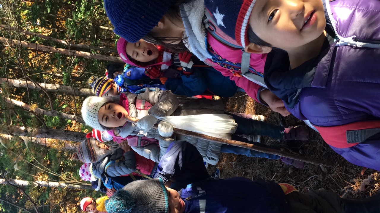 駐車場の道路脇にあるモミジバフウの木の紅葉を見てから、いつもの裏山へ。森の入り口にあるお地蔵さまの前を通ると、ここにも大きなイロハモミジの木があって紅葉真っ盛り。子どもたちも口々に「きれー。」「ママにおみやげにする。」と、気に入った葉を拾いながら先へと進んで行く。年少女児二人は、葉の他にもまつぼっくりを見つけては拾いながら歩いていた。