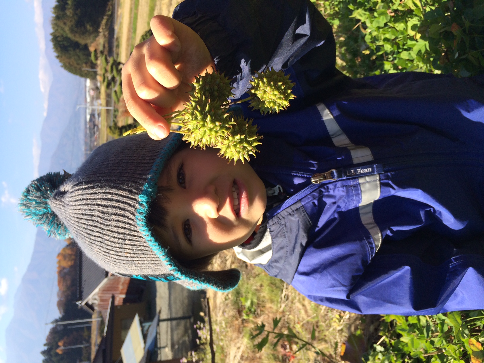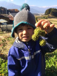普段は草花を摘むことより棒を振り回している年長男児4人も夢中になってモミジバフウの葉を集めていた。その中のSは、トゲトゲのモミジバフウの実が気に入ったよう。また、Tの持っている葉は全部色が違っていた。