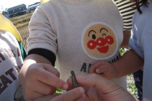 イナゴを保育者が見つけると、びっくりした表情をしたり恐る恐る見る子ども達。