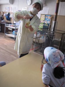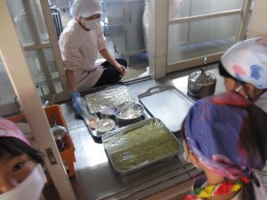 それから、給食室に材料(さつまいも・砂糖・バター)を持ちに行きます。