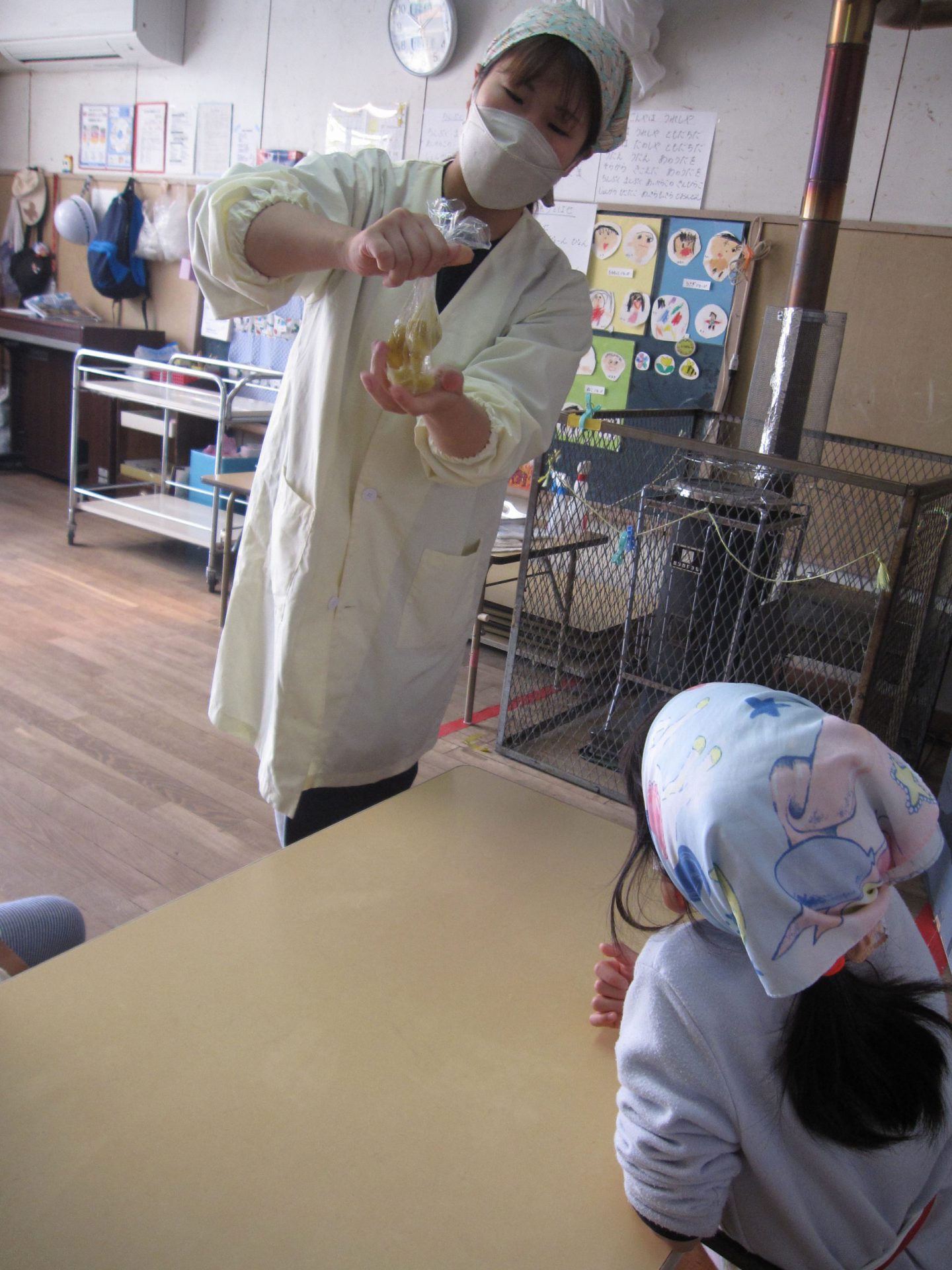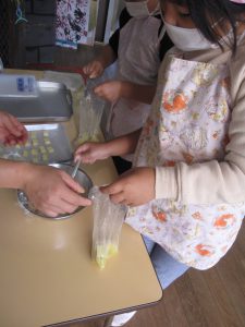 ビニール袋に蒸かしてもらった🍠さつまいもを入れてもらいました。その後、ひとり一人が、スプーンでバターと砂糖を入れます。