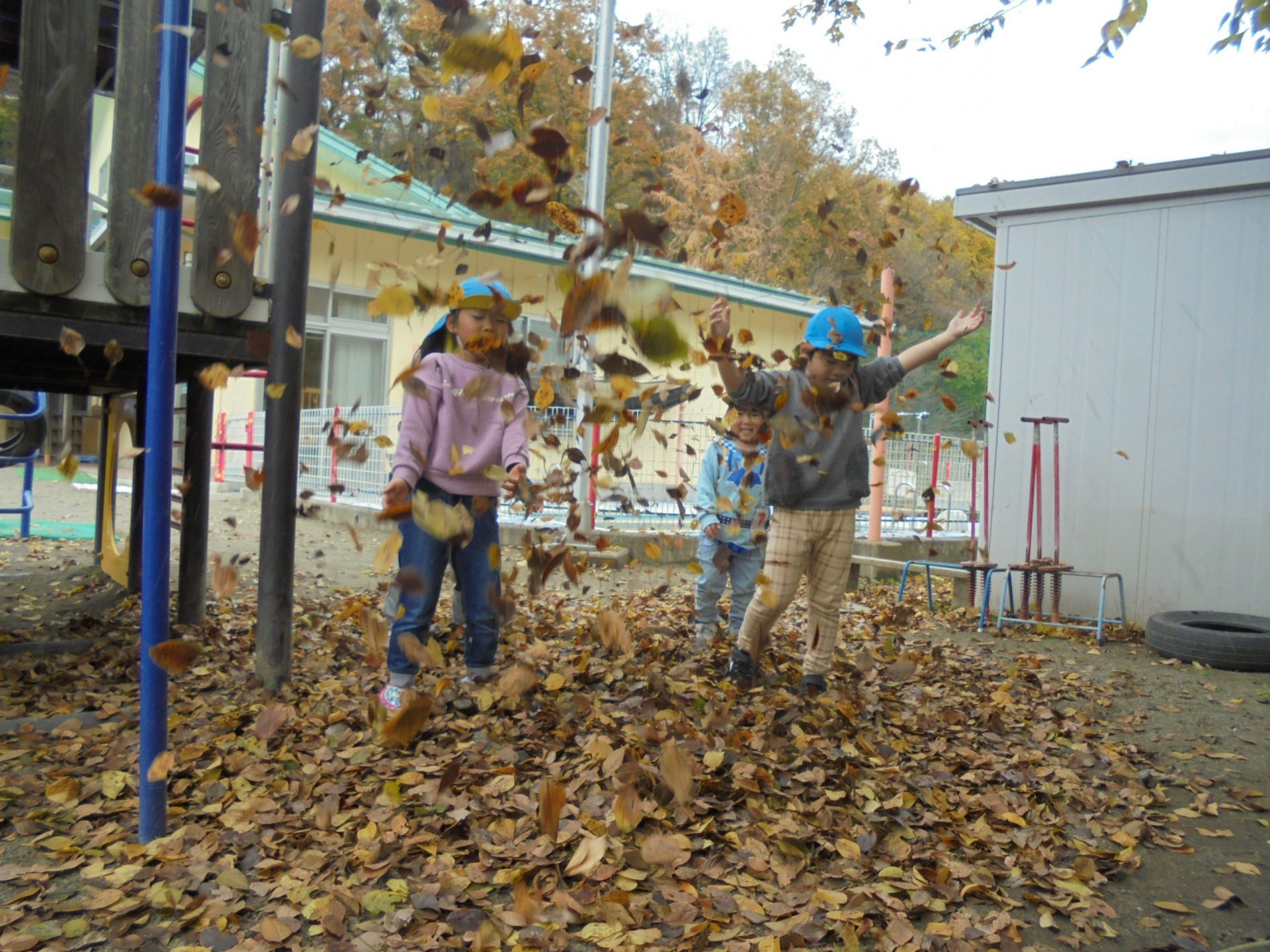 待っている間は、園庭の落ち葉シャワー🍂