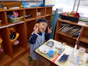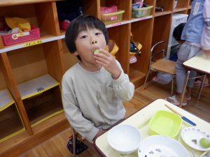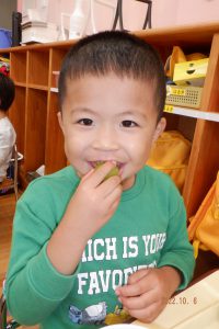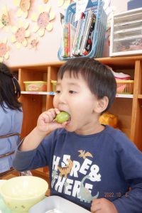 ・自分で選んだぶどうが大きく育ったことに喜びを感じたり、ぶどうの甘味やみずみずしさを味わうことで「このぶどう好き。」という言葉が自然に出てきたのではないでしょうか。いつまでもこの体験やぶどうの味を覚えていて欲しいと思います。
