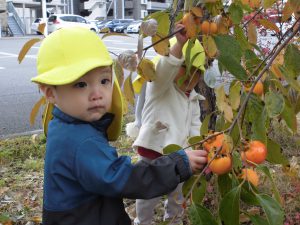 ・散歩先で木になっていた柿を見つけ、触っていました。