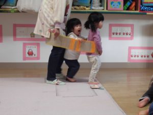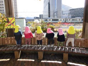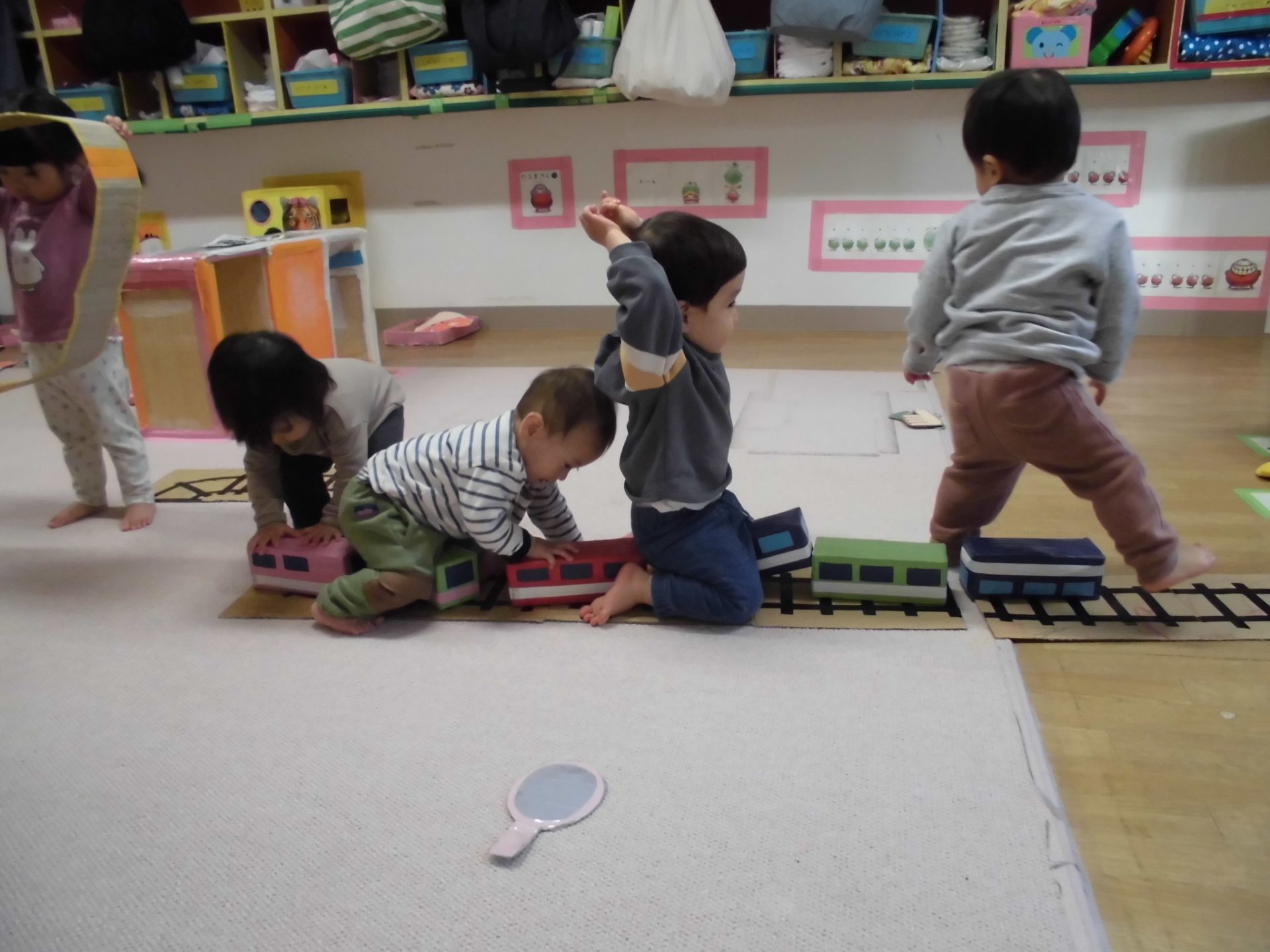 保育園に帰ってきてからは、散歩で見てきた電車や新幹線を思い出したようで「がたん、ごとん~」と言いながら、お友達と一緒に電車ごっこが始まり・・・・