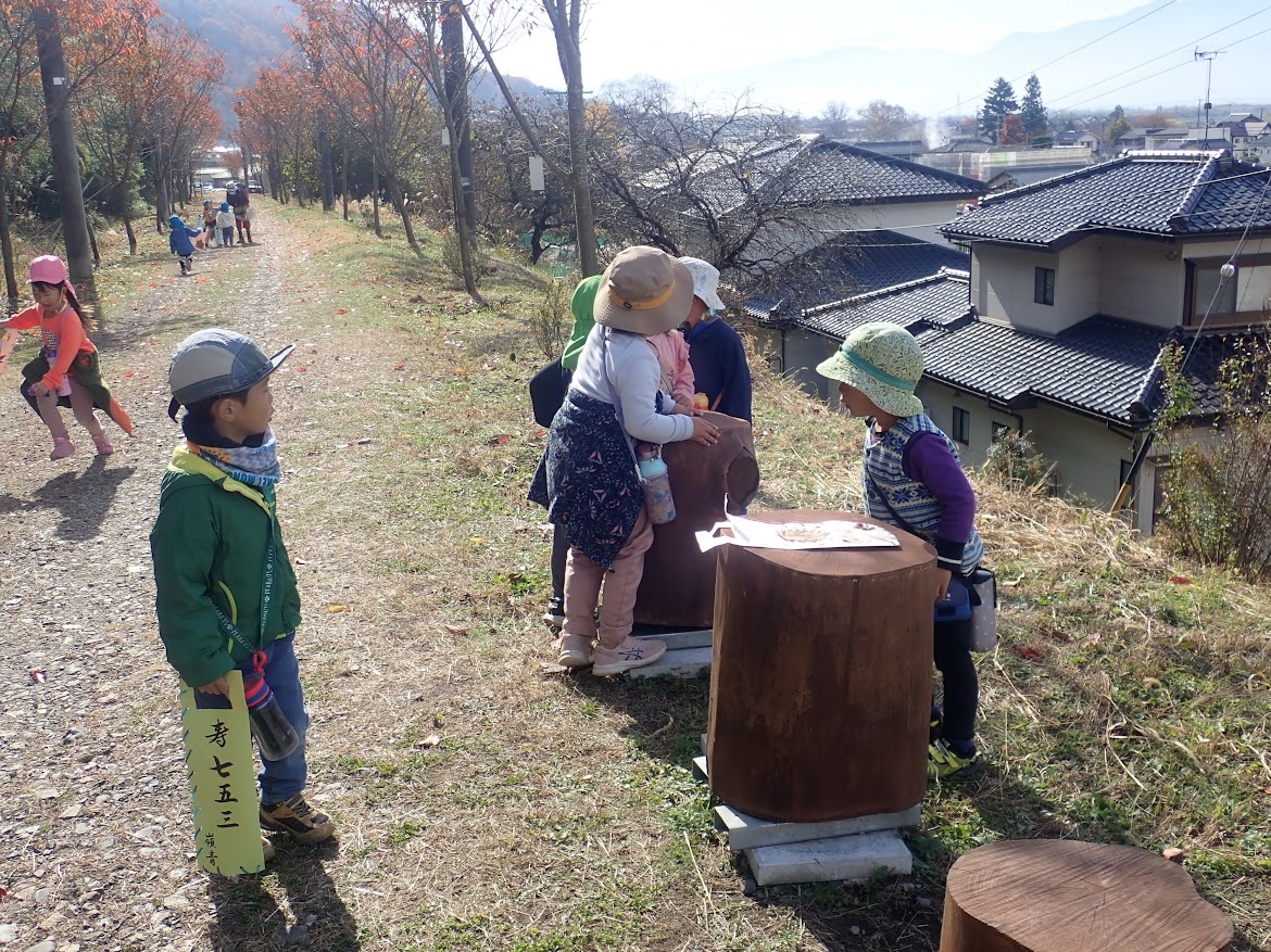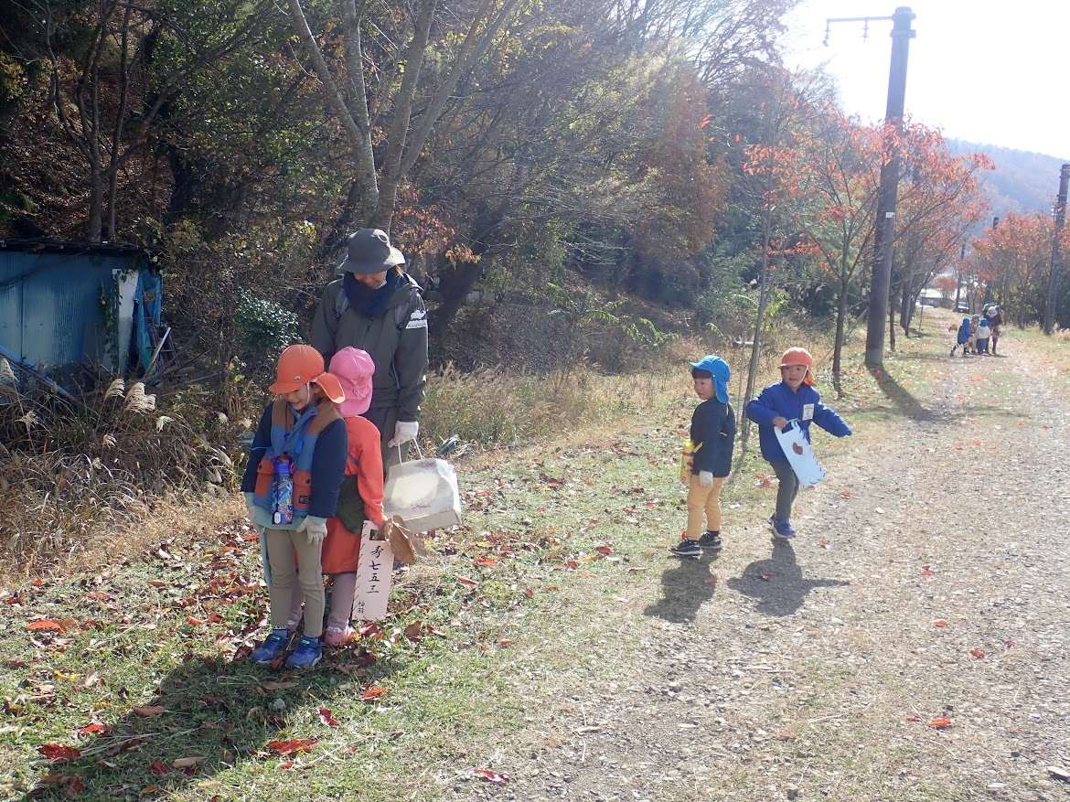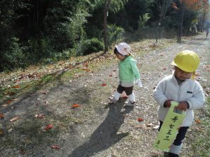 紅葉した葉っぱを見たり、拾ったり、秋の陽射しの中を存分に歩いて園に帰ってきました。