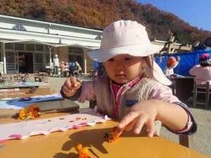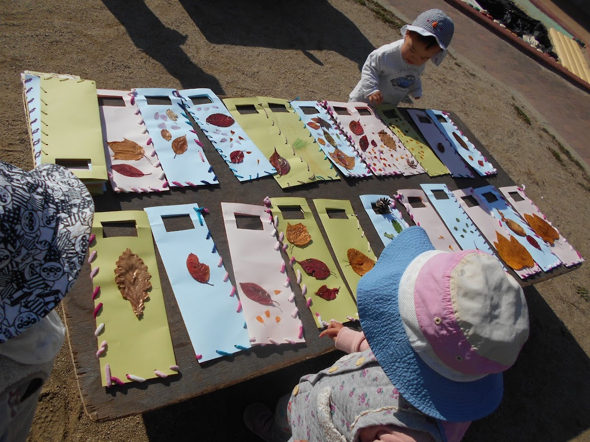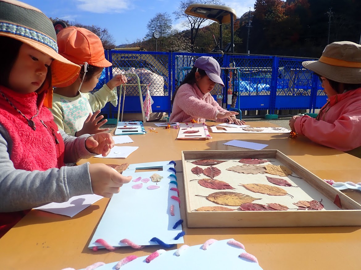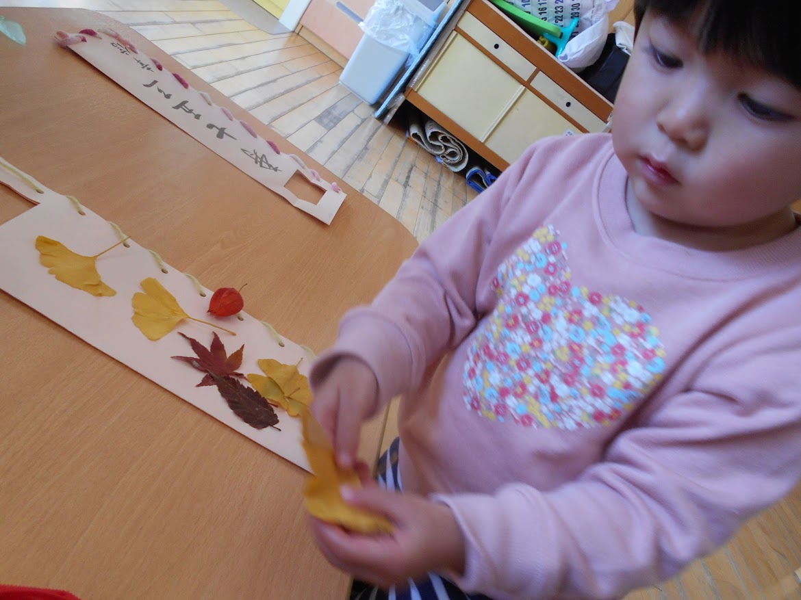 毎日の落葉から、知らず知らず、子どもたちは美しい葉を探し、保育士や友達と見せ合う光景が常です。